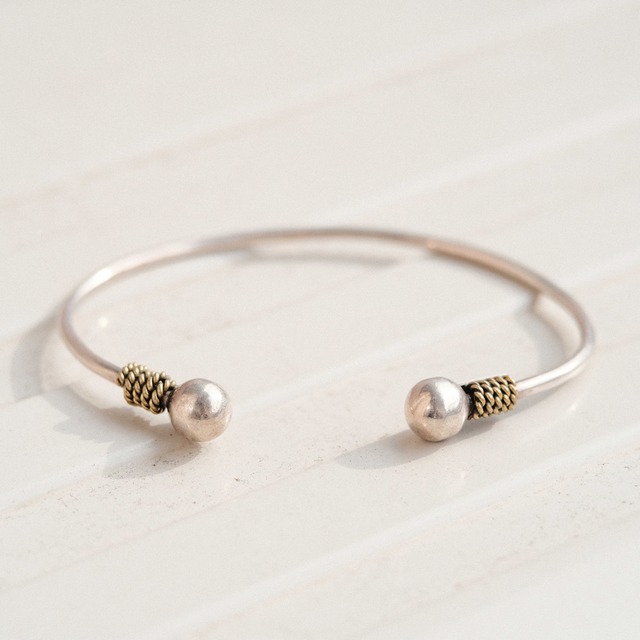 バングルデザインのメキシカンシルバーブレスレット。 メキシカンジュエリーらしい味のあるシルバーボディーからは適度なラフさや無骨さが感じられ、着用するとアメカジやバイカーファッション、デニムなど自然とアメリカ臭さのあるものを身に着けたくなる空気感に満ちた魅力的なジュエリーです。 そのようなオーセンティックなメキシカンジュエリーとしての魅力を持ちつつも、同時にほんのりとした上品さ、優しさ、女性らしさもデザインニュアンスとして内包している点が身に着けるために製造されたジュエリーとしての魅力に拍車をかけているように感じます。 バーの両端のボールデザインがくすんだシルバーボディーとの調和を保ちつつもアイテム全体に柔らかさを与えており、ブラスのロープデザインがヴィンテージティファニーやエルメスジュエリーのようなほんのりドレスで上品な雰囲気を醸し出しています。 カラーの面でもデザインの面でも、アメリカ的な空気感のあるファッションに違和感なくドレス寄りのジュエリーを組み込む際の接着剤としての役割を果たしてくれる魅力的かつ希少なアイテムと言えるかと思います。 ゴールドジュエリーと合わせることも、気分に合わせて着用時の開口部の位置を変え、手首周りでの表情を変えることもできる魅力的なピースです。 素材: シルバー、ブラス 内周: 約19.1cm(約16.8cm+開口部約2.3cm) 幅: 約2.2mm 商品番号: H2601004 ※ご購入前に「About Our Items」欄をご一読下さい。