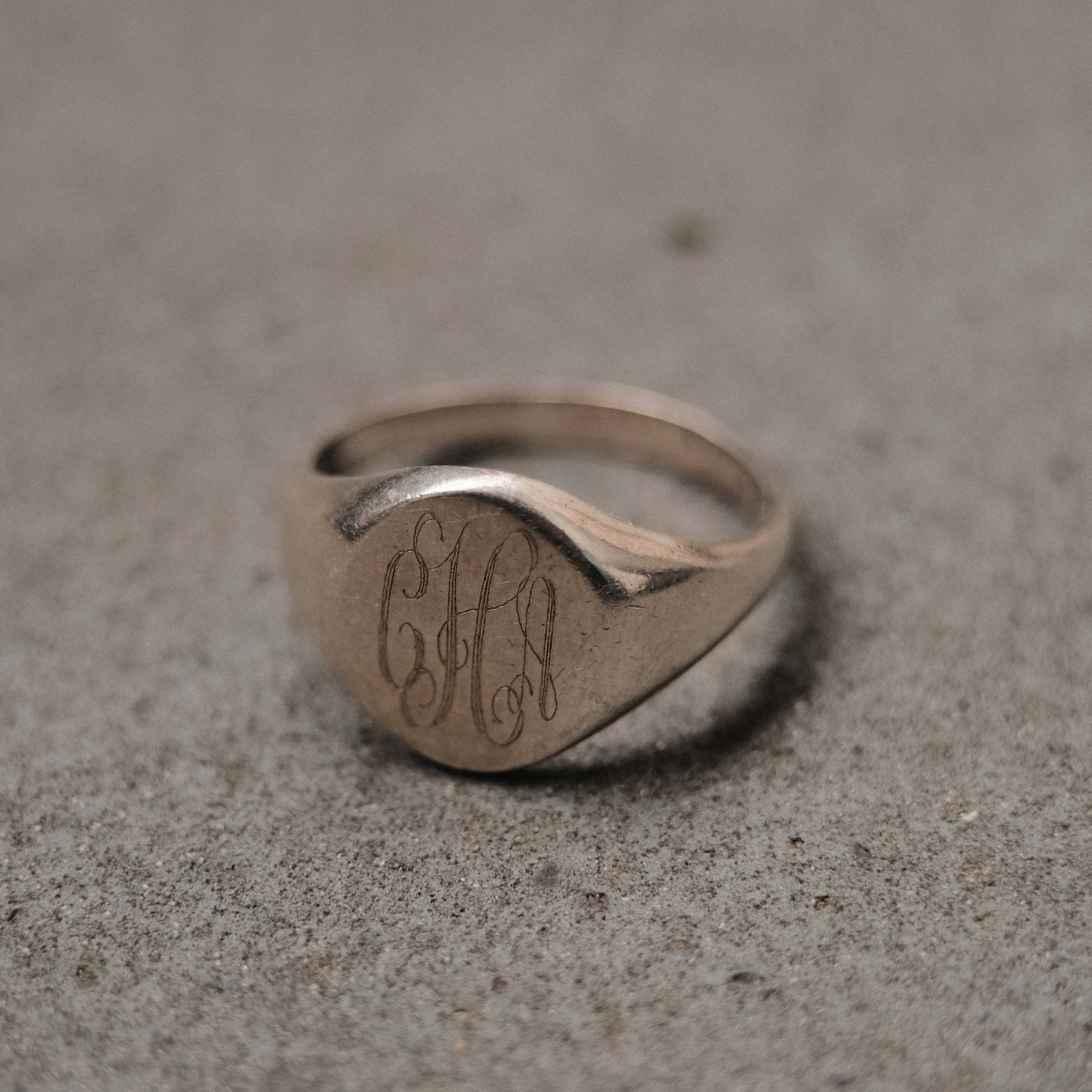 アメリカルーツのオールドシルバーシグネットリング。ルーツの英国シグネットリングを思わせるエレガントさは保ちつつも、適度なカジュアル感と無骨さを纏った雰囲気のあるアイテムです。トラッドやドレッシーなファッションにはもちろんのこと、よりカジュアルなファッションの中でも活躍してくれるかと思います。