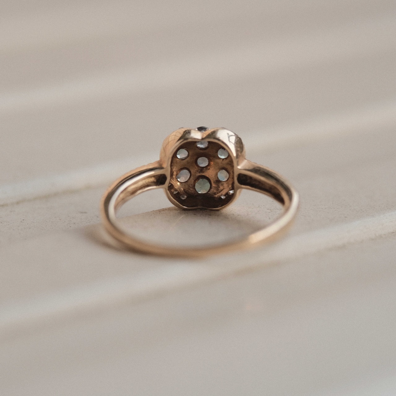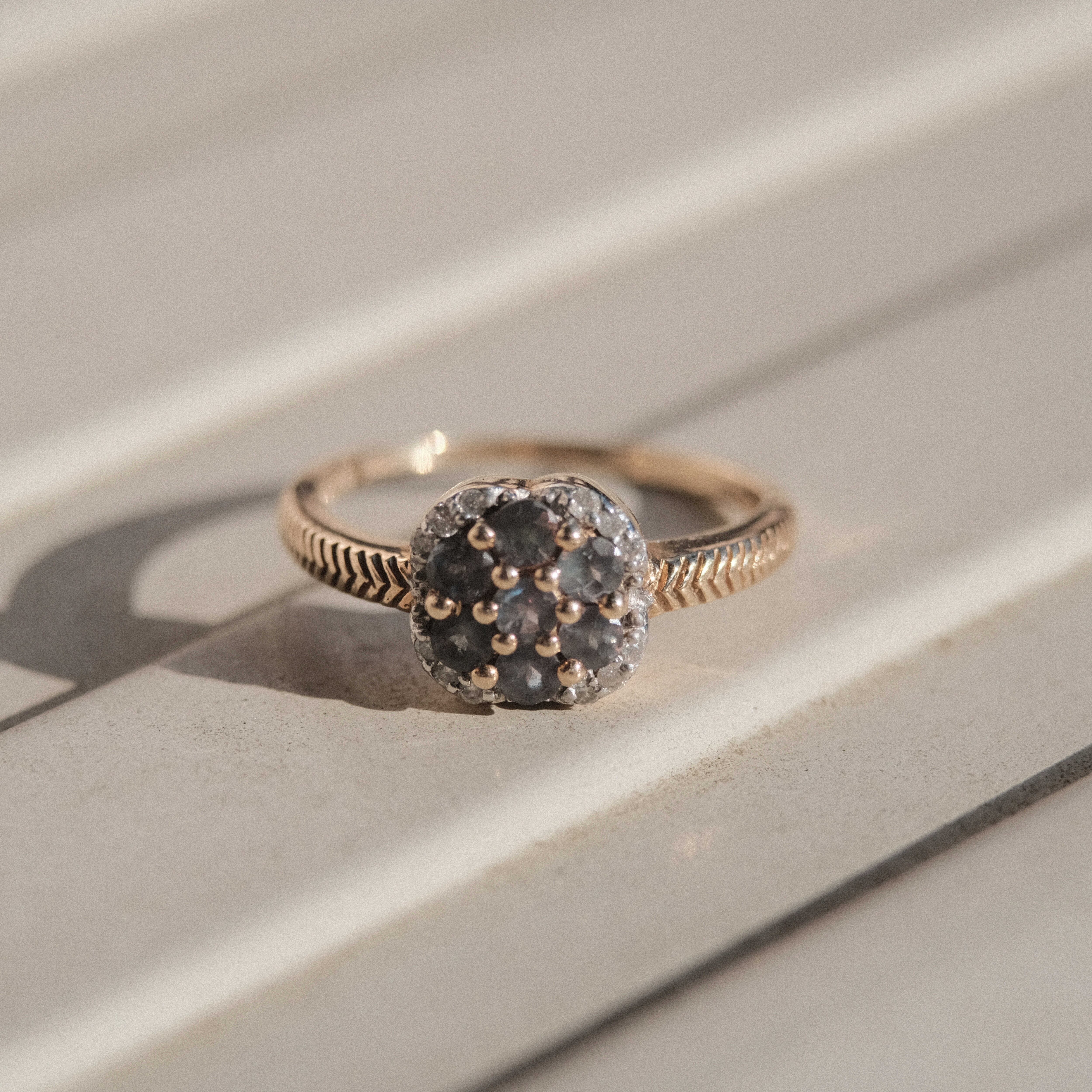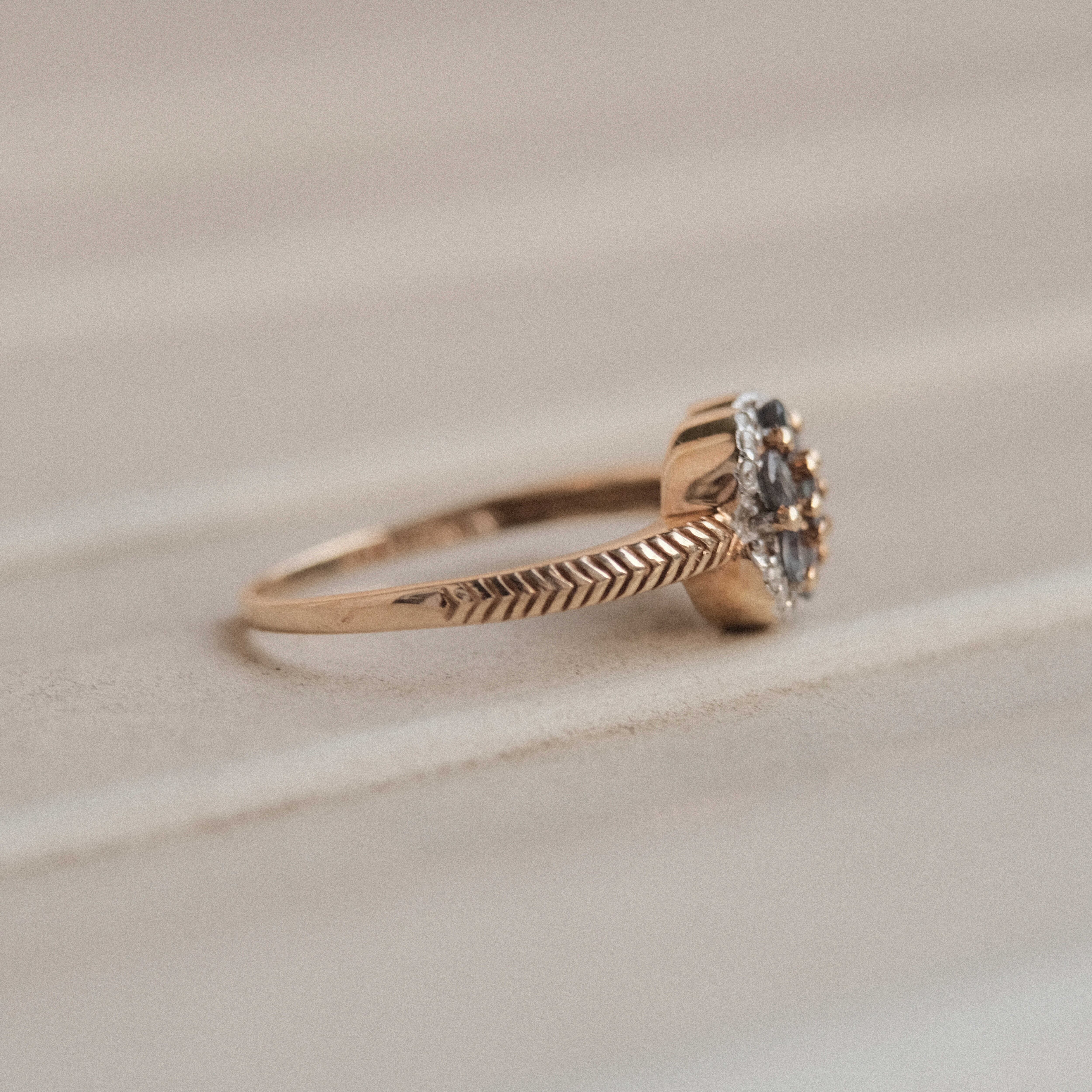 一般的にこのリングのように花を思わせるような形状に石がセッティングされたリングをデイジーリングまたはクラスターリングと呼びます。