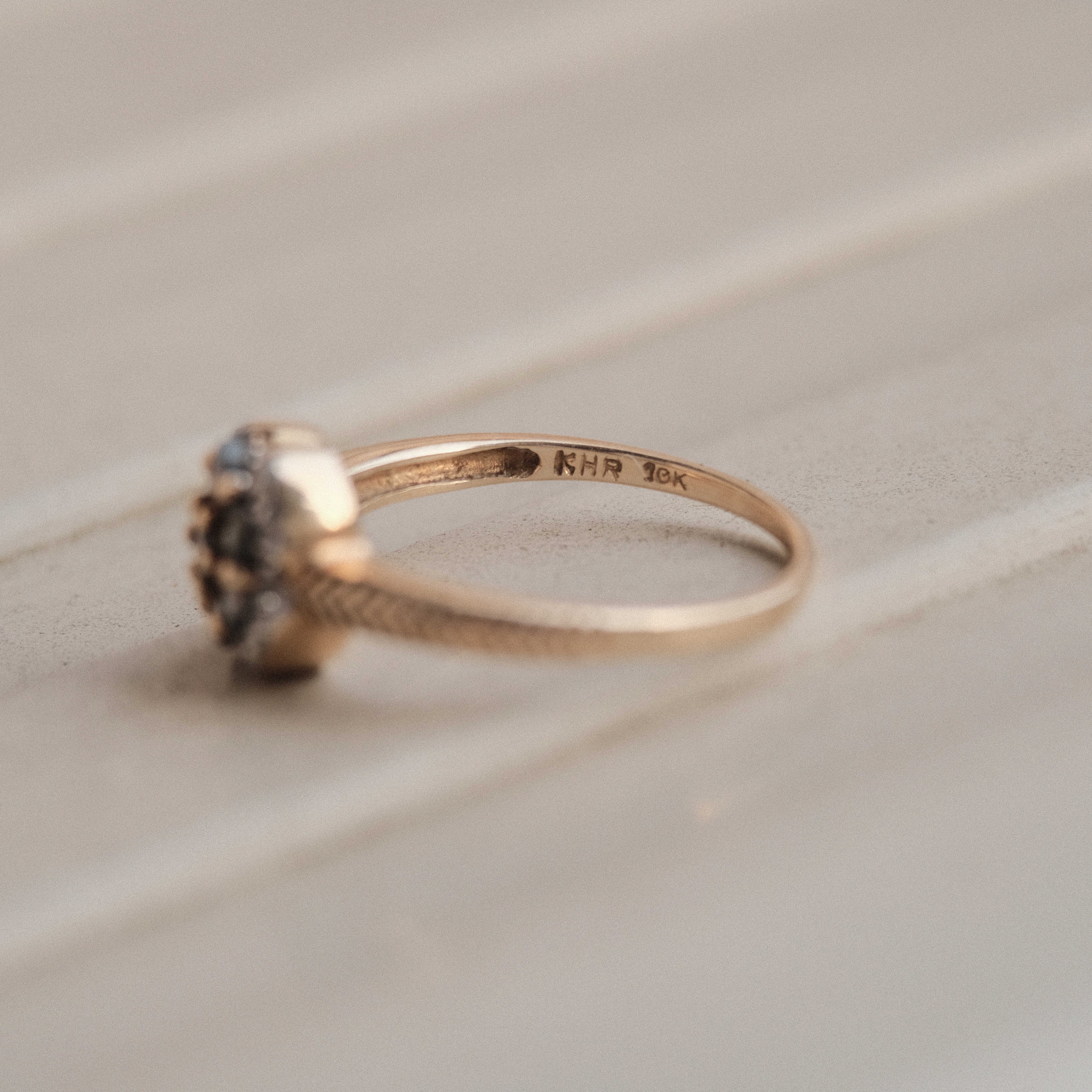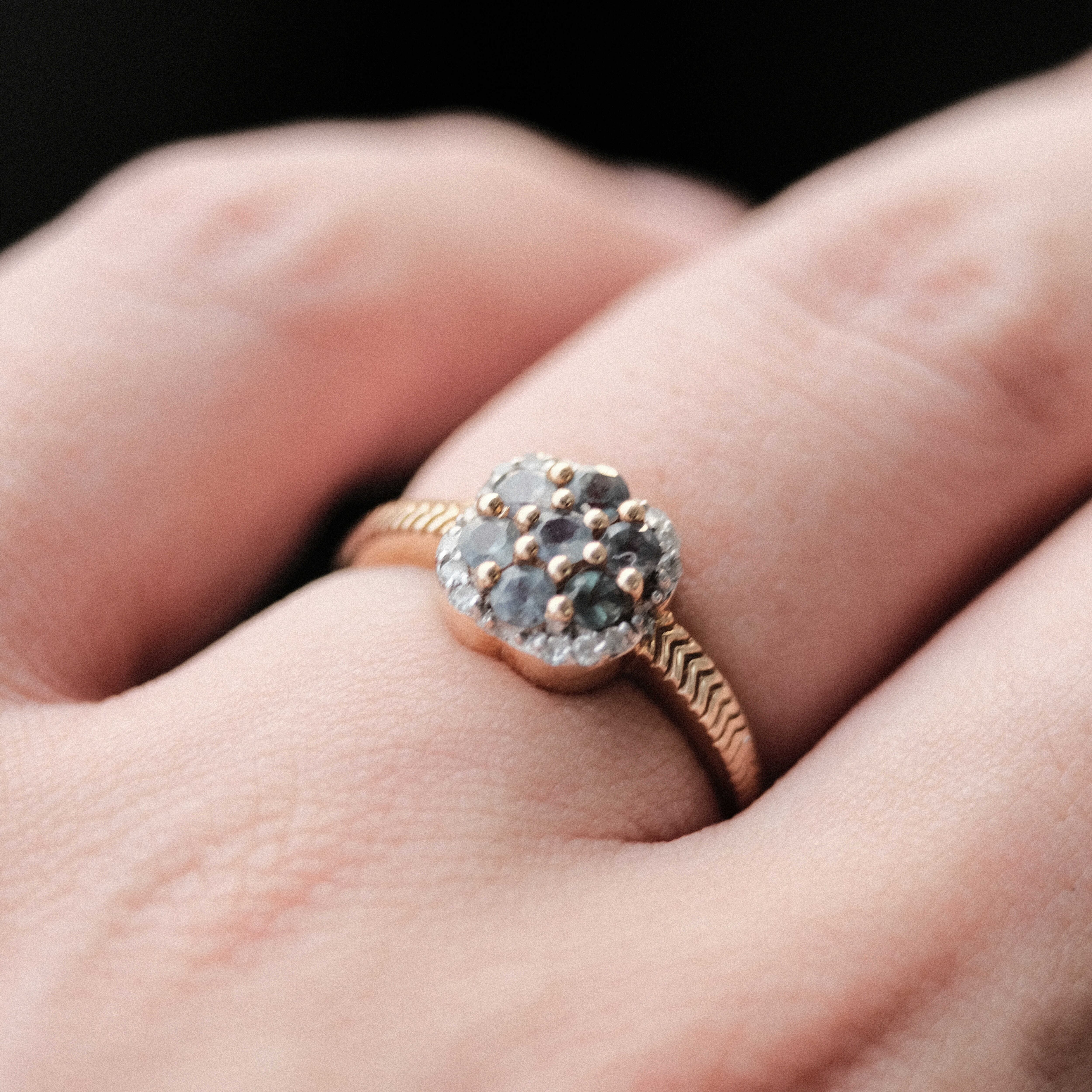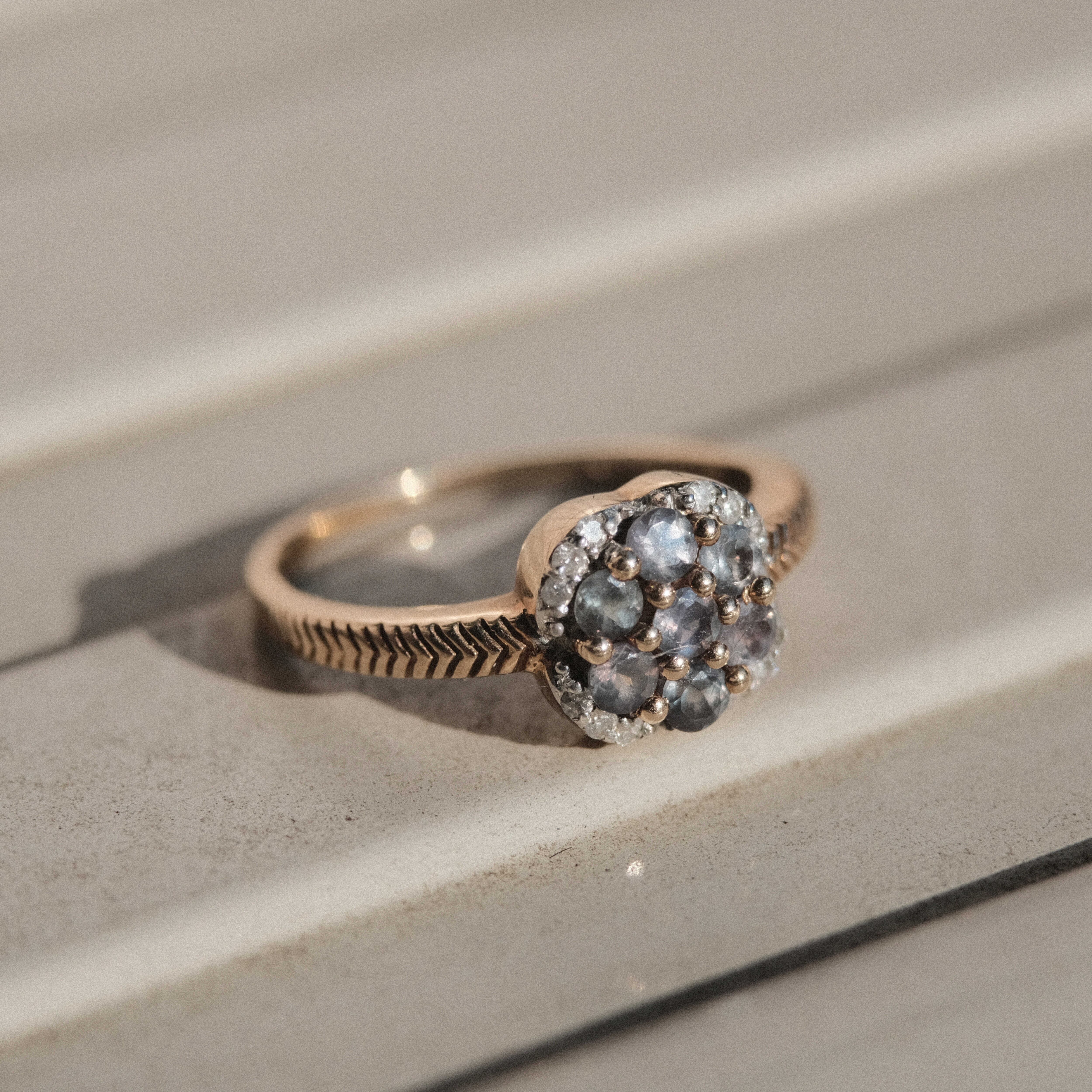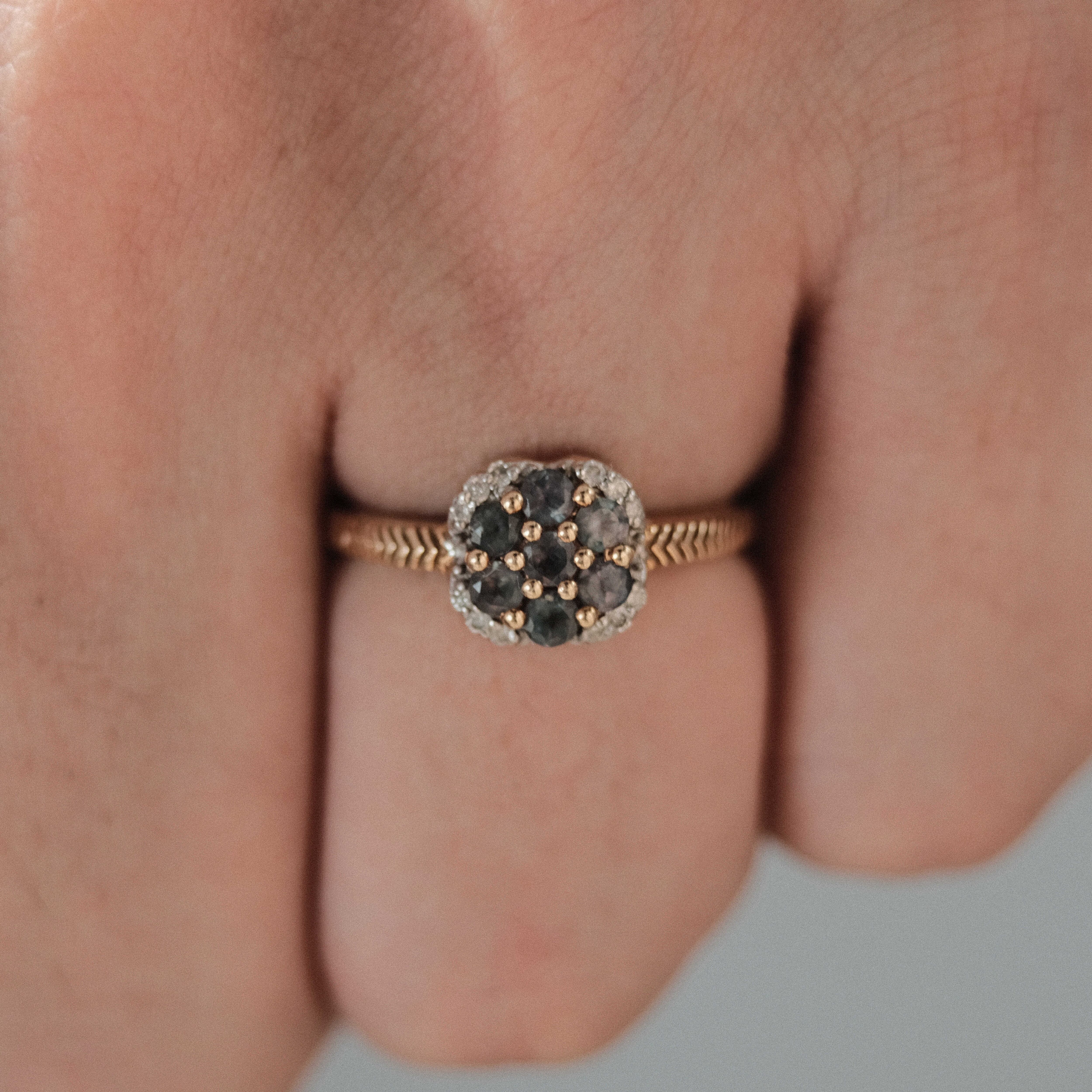 一般的にこのリングのように花を思わせるような形状に石がセッティングされたリングをデイジーリングまたはクラスターリングと呼びます。