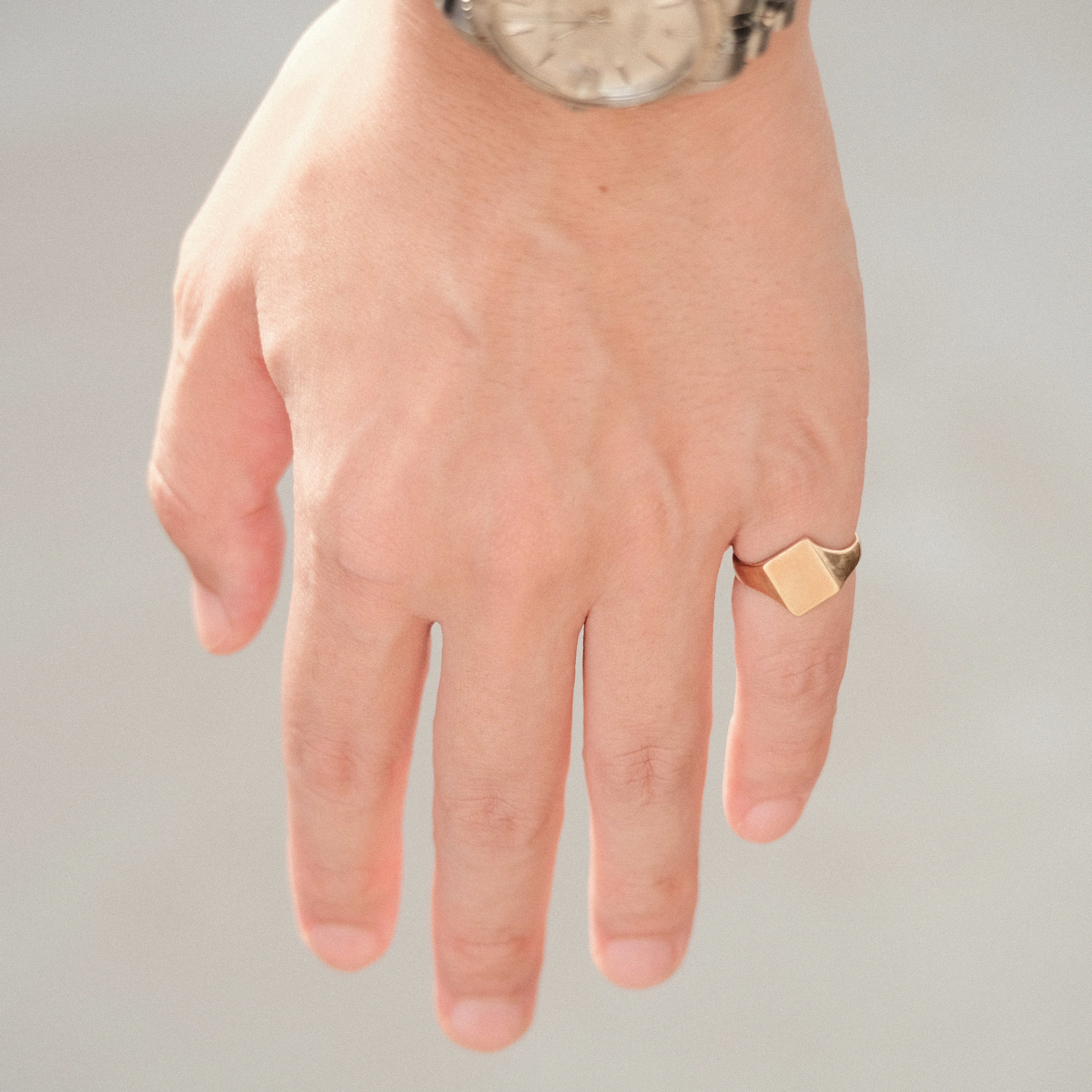 遭遇することのほとんどない非常に珍しい形状のリングではありますが、シグネットリングというトラディショナルなジュエリーのカテゴリーに軸足を置いているアイテムなので、「扱いづらいリング」ではなく「良い違和感と個性のあるシグネットリング」として着用できるのが魅力的なポイントです。