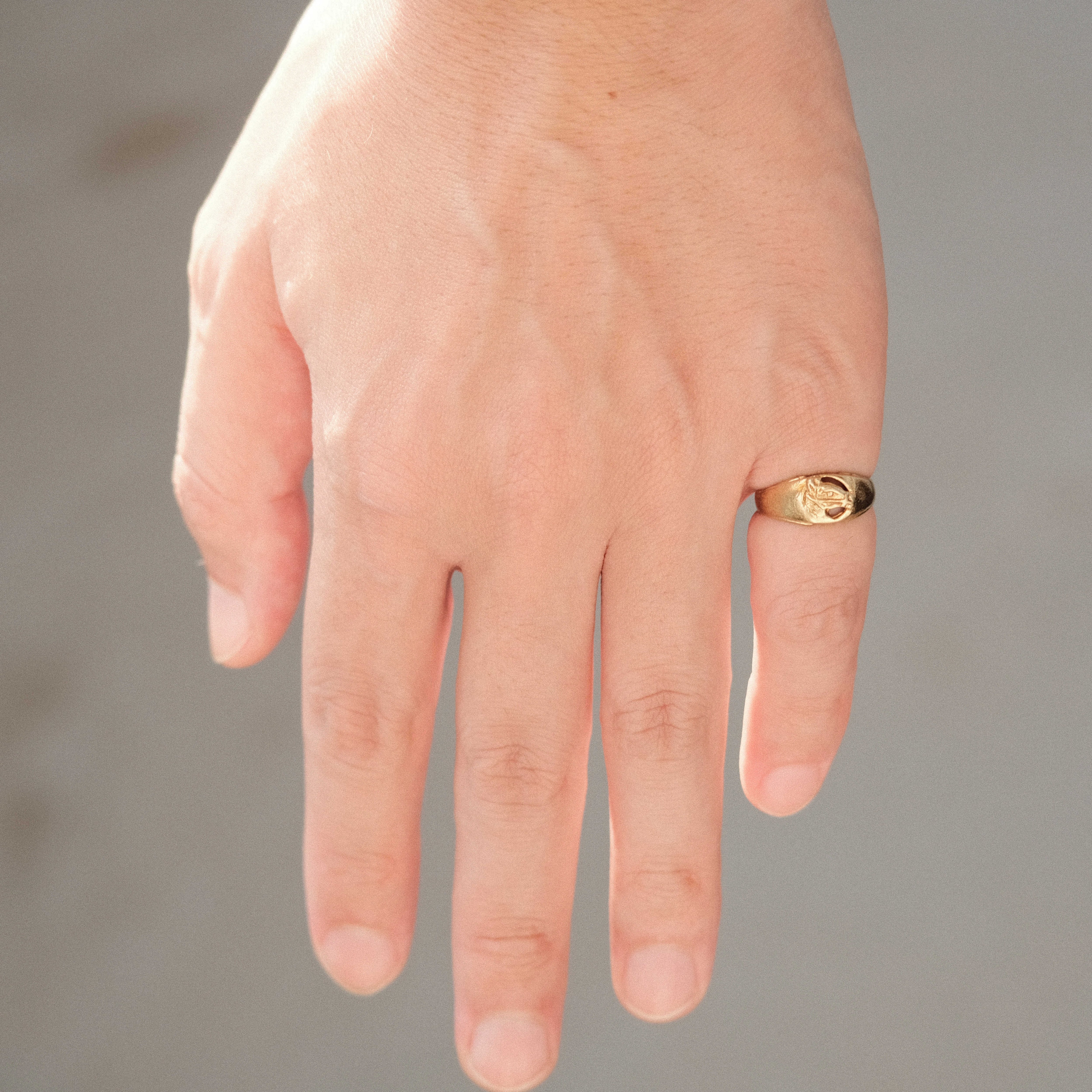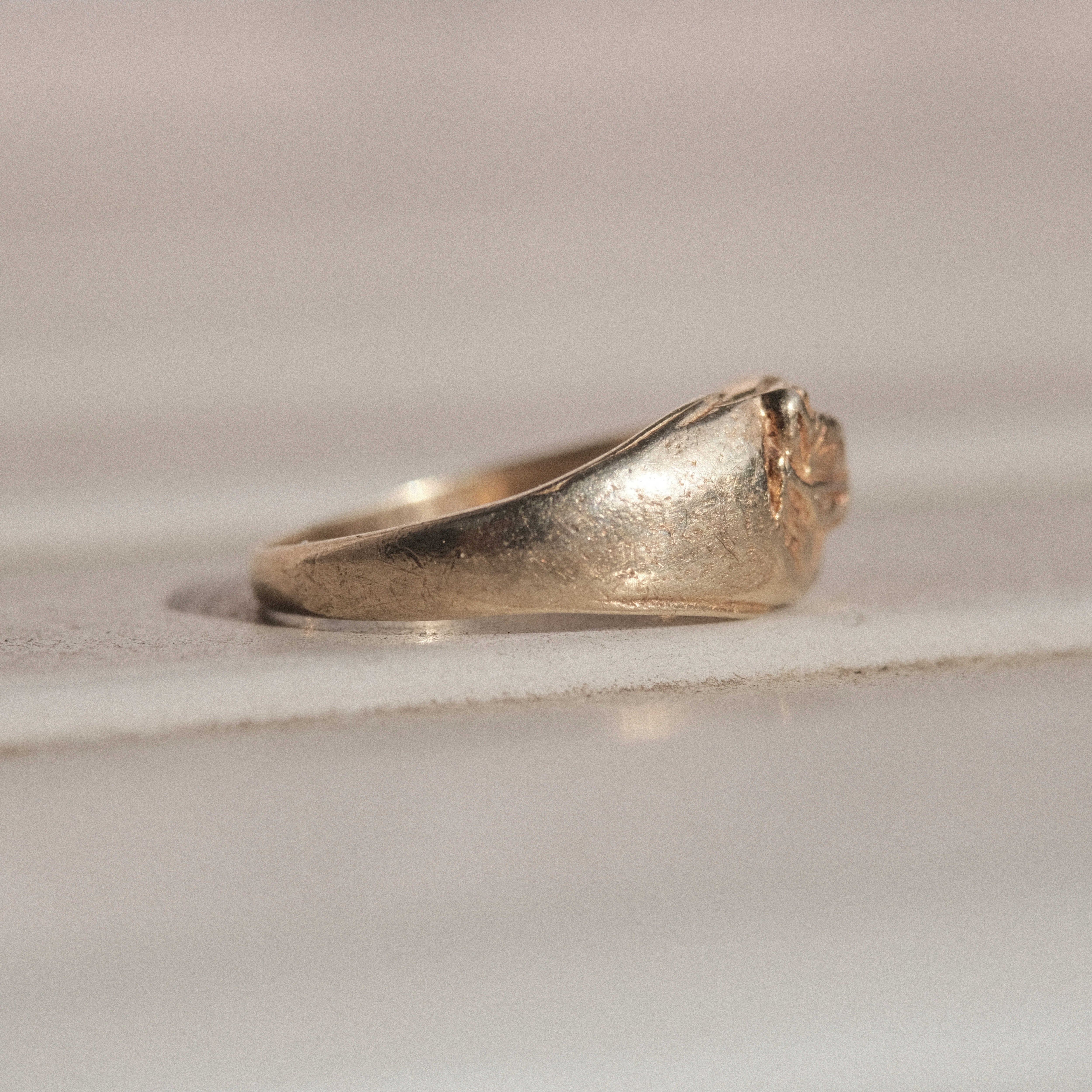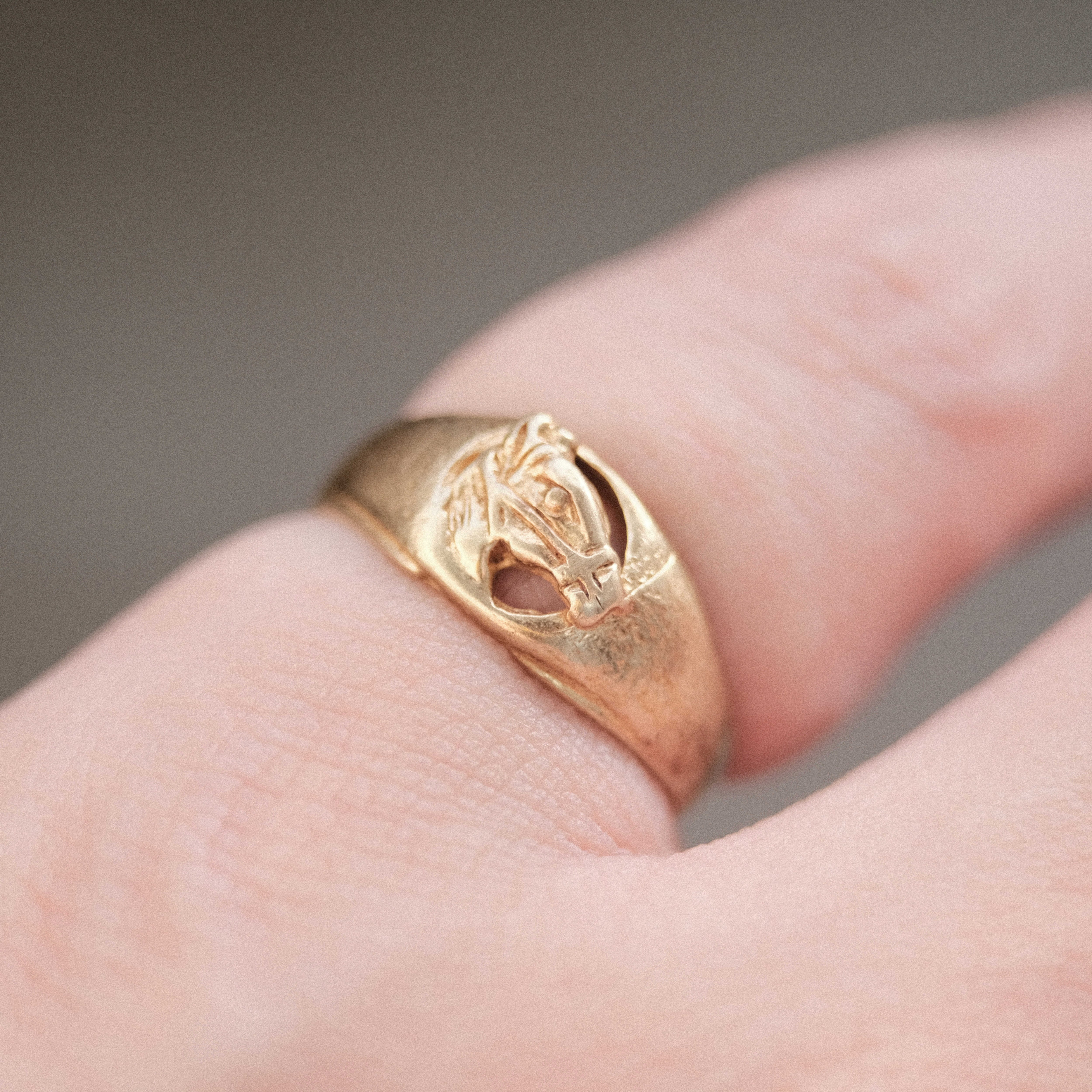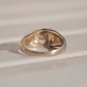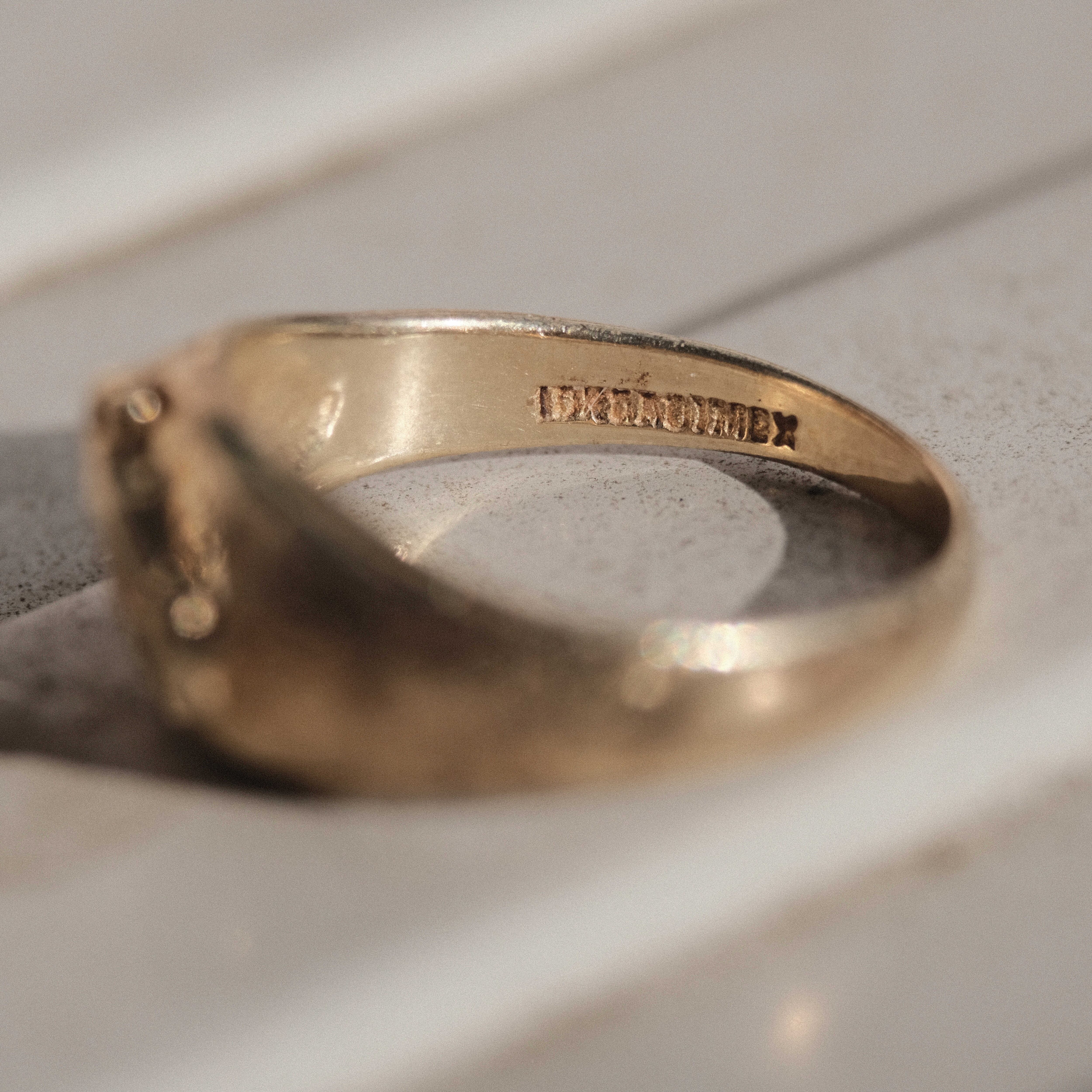 そこに古いゴールドの色味が組み合わさることで、ヴィンテージ好きにはたまらない唯一無二の空気感が完成しています。ここまで「ヴィンテージアメリカンデザインの魅力」を詰め込んだリングには未だ出会ったことがありません。