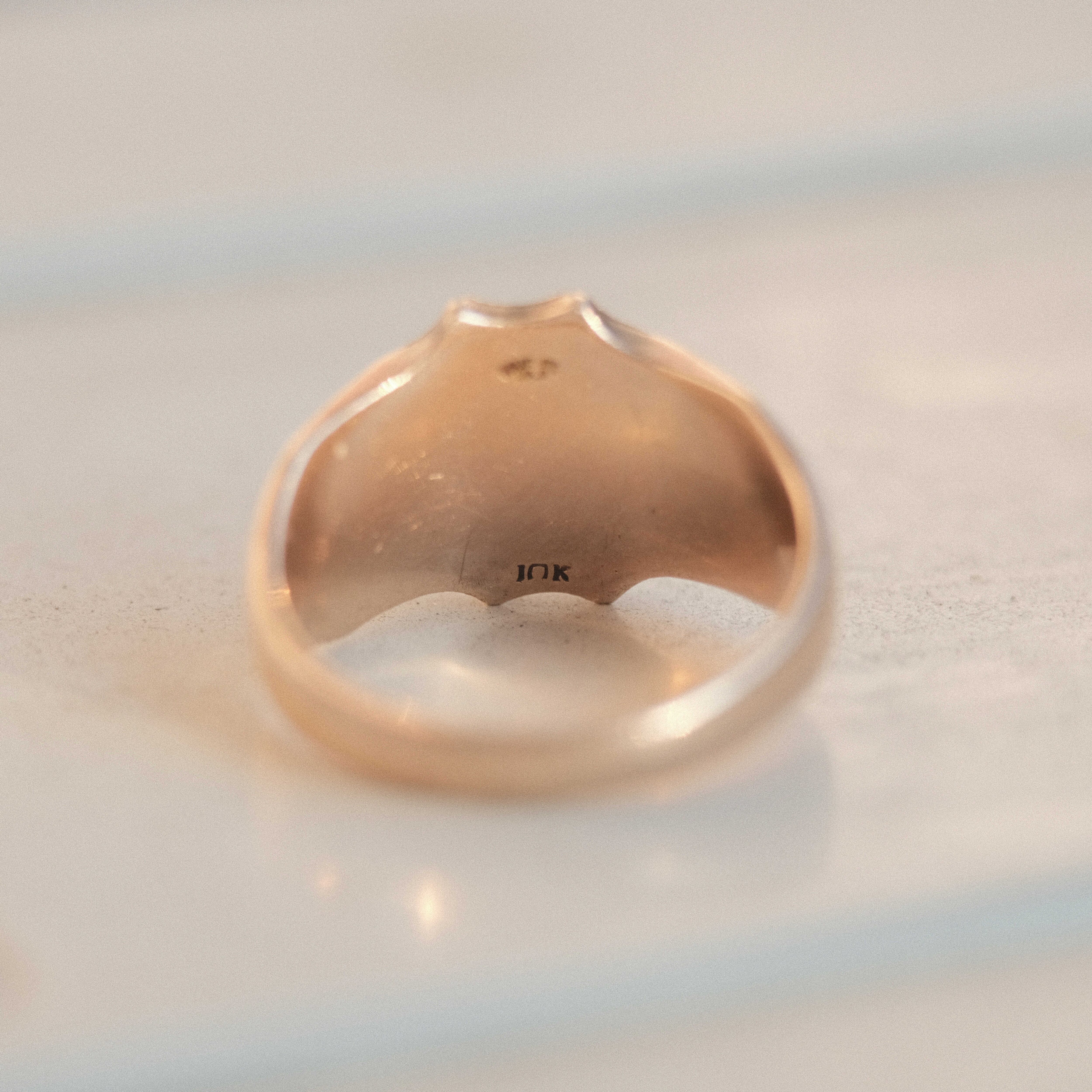 よりインパクトの強いアメリカらしい装飾を纏うようになる40s以前のクラスリングであるため、適度なアメリカらしい良い意味でのクセはありながらも、デザインルーツのシグネットリングらしいシンプルな表情を味わえる個体です。個人的な感覚にはなりますが、この時代のクラスリングは後のものより「アメリカ感」が控えめなため、現代のファッションとの相性がより良いと感じます。