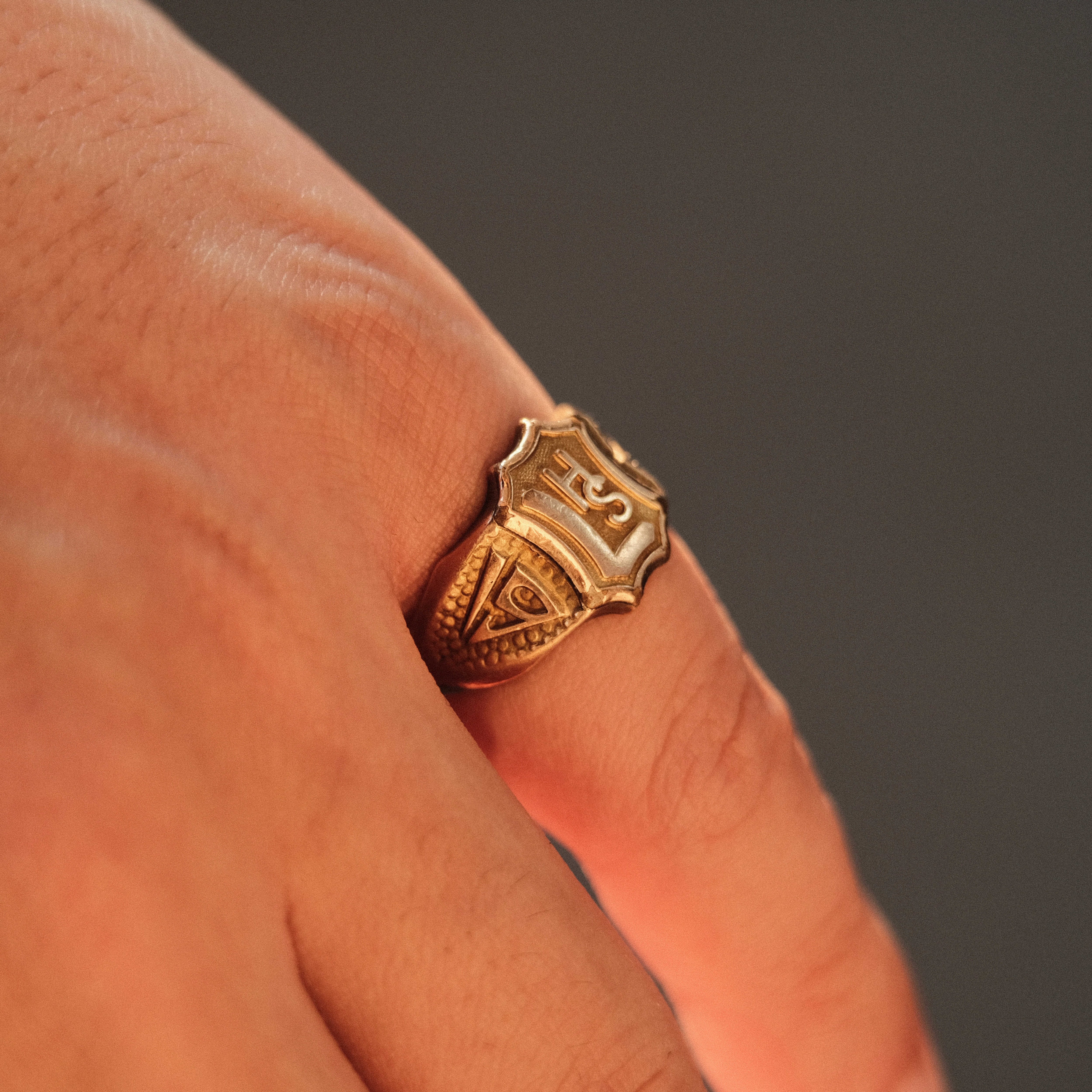 そのような時代のクラスリングの中でもこの個体からは現代のファッション的審美眼にも耐えうるセンスを感じます。着用時に感じられる重みとリング全体から放たれるヴィンテージトーンのゴールドカラーが強いラグジュアリー感を感じさせてくれます。また、トップイニシャルデザイン部分の文字フォントや配置、サイド部分の年号の手書き感からは「格好良すぎない力の抜けた雰囲気」が放たれています。さらに、ほんのりとどこかしらストリートな空気感も感じられAime Leon Doreなどのブランドがサンプリングしていてもおかしくないほどのこなれ感すら感じられるアイテムです。