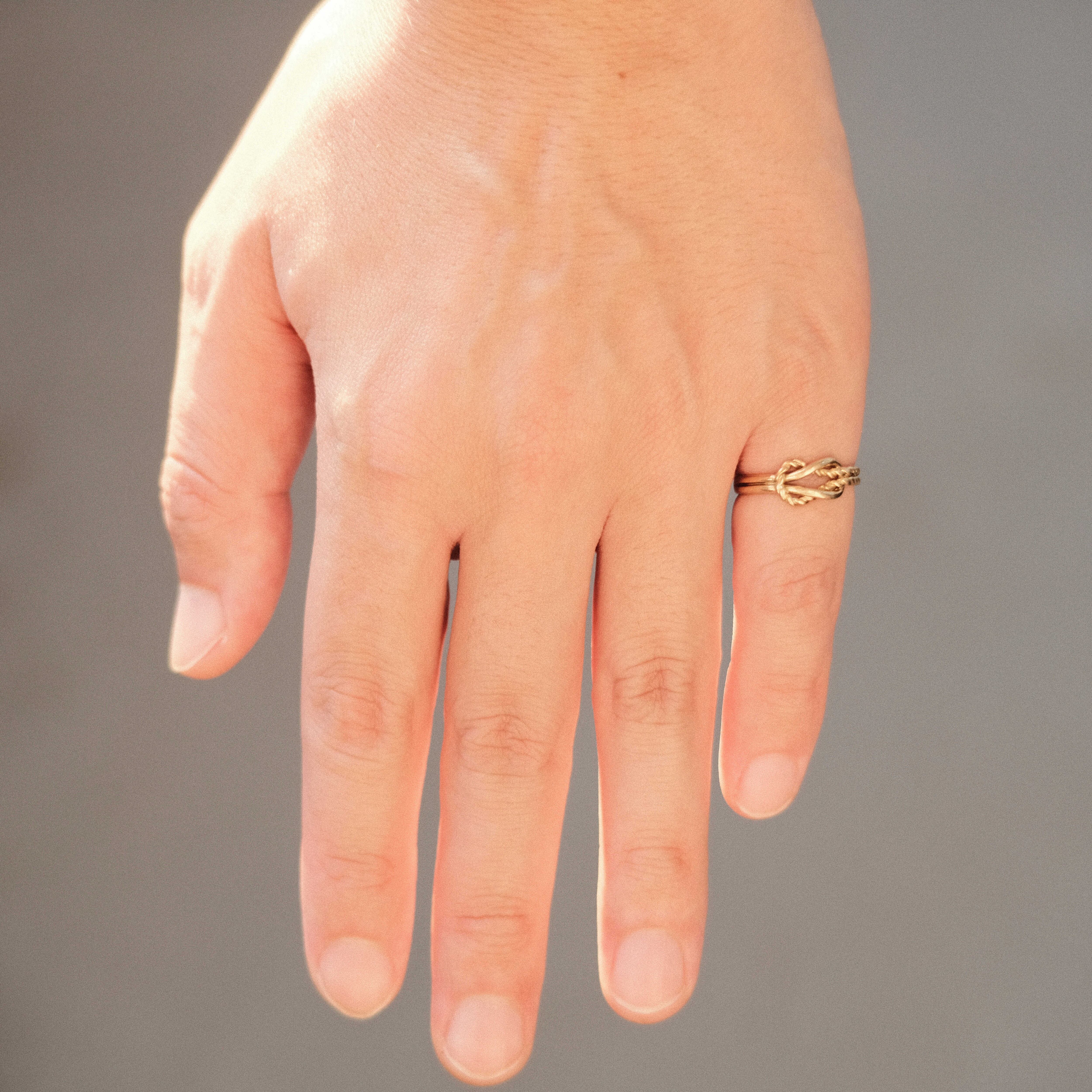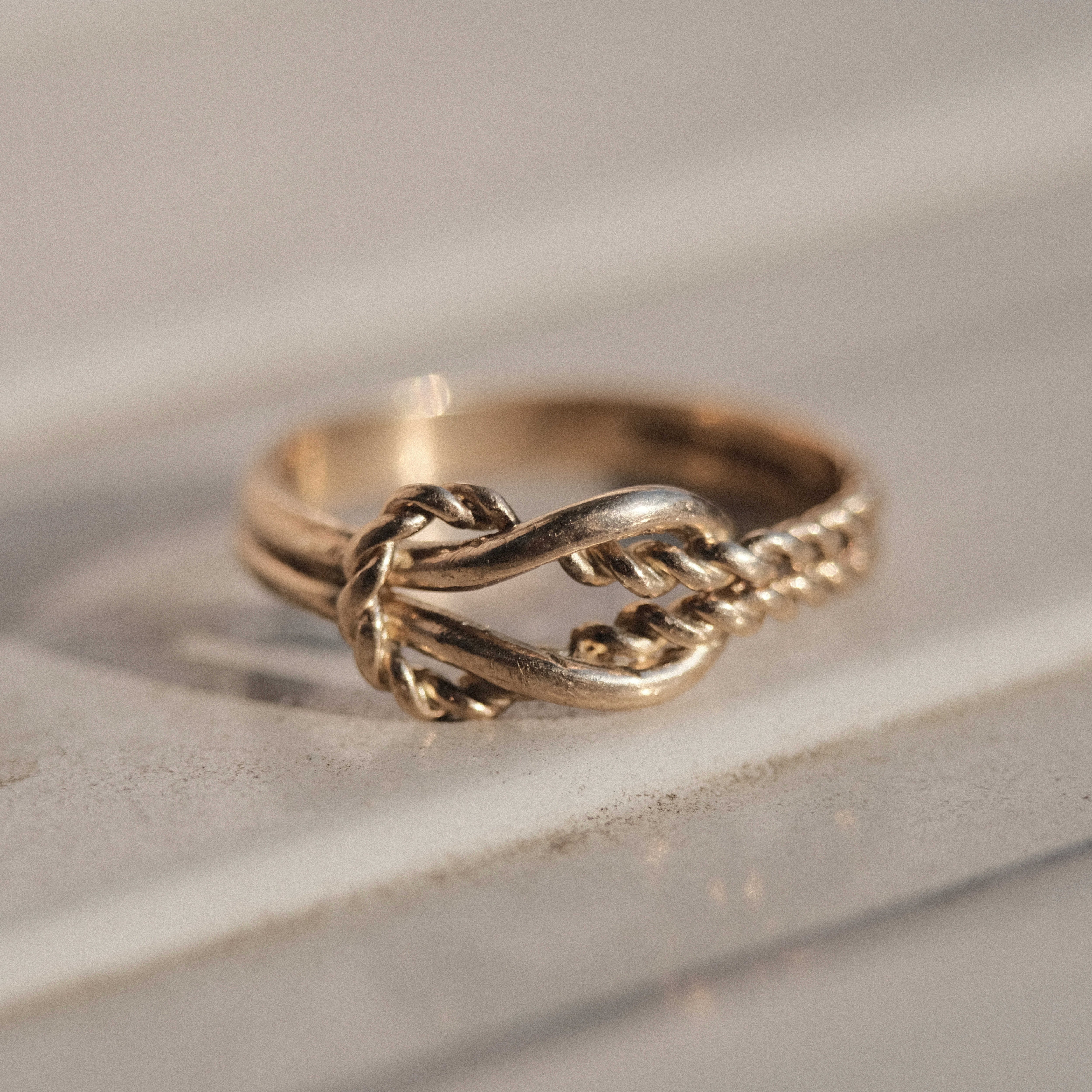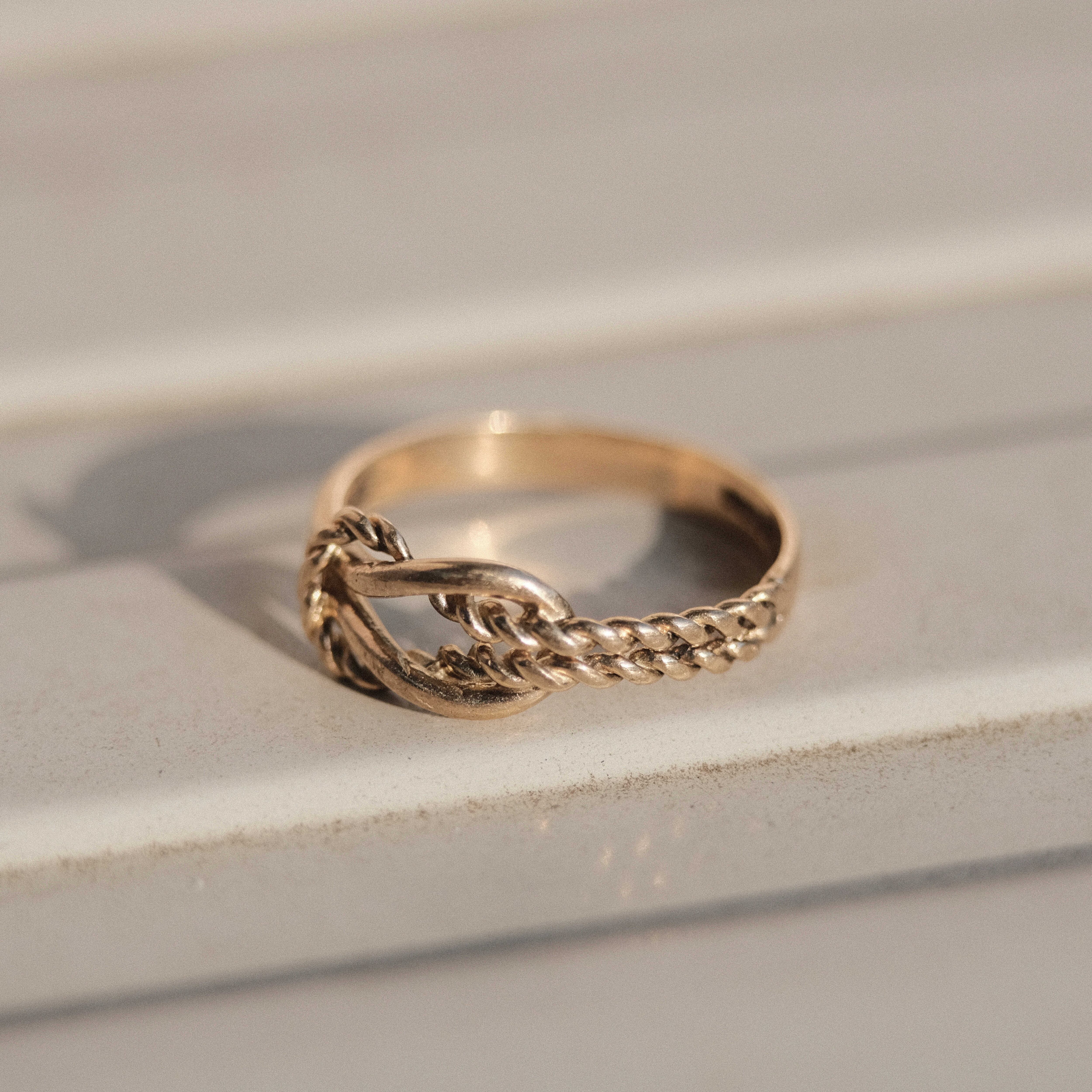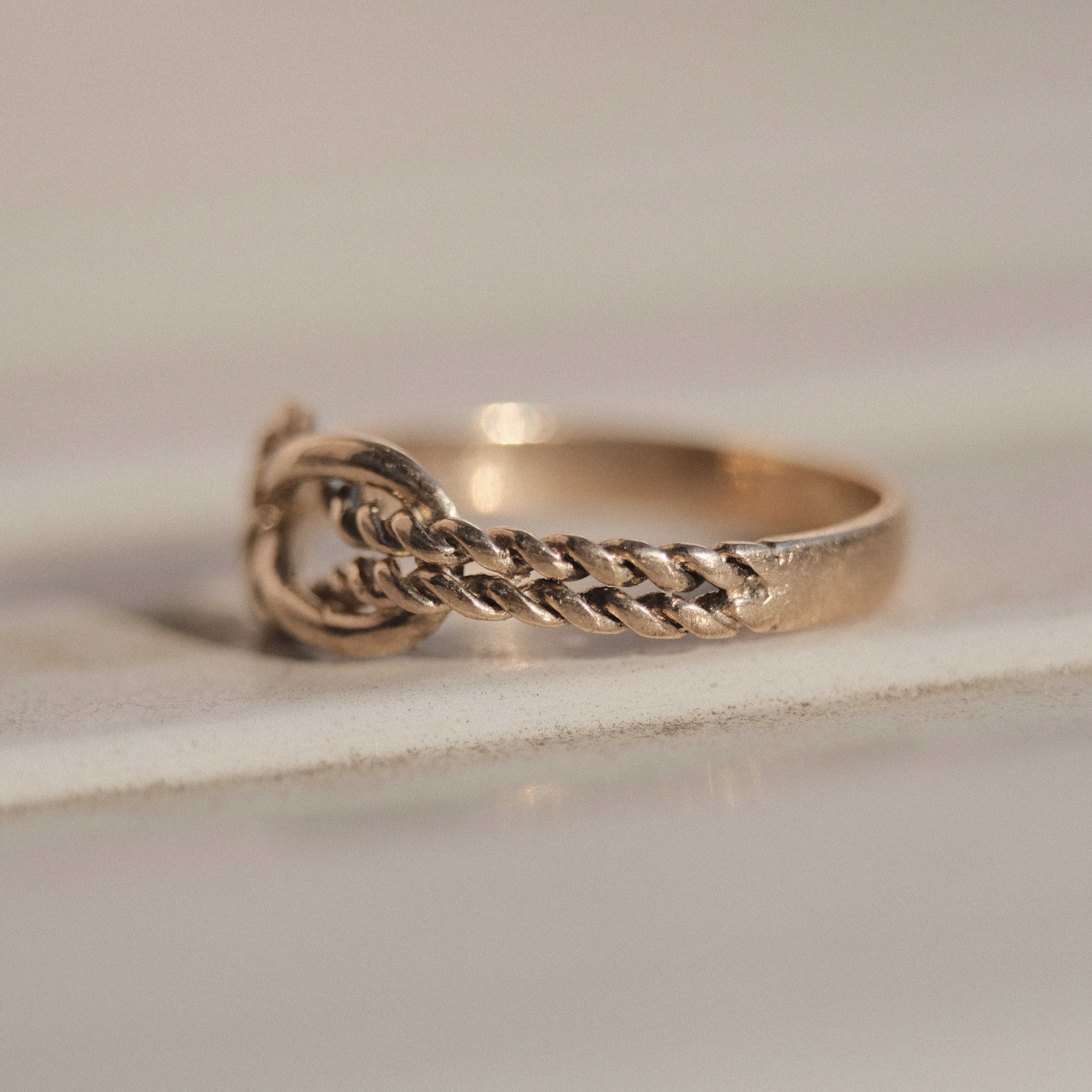 ノットデザインのリングを探してみるとふっくらとした立体的なシルエットのものやリング全体が網目の無いつるっとした表情のロープデザインのものなど、女性的なものが多いことに気づきます。そのような中この個体は味わい深くデザインに組み込まれた網目調のロープデザイン、高さの抑えられたバンドリングに近いシルエット、そしてヴィンテージゴールドの落ち着きと適度に渋みのある味わい深いトーン、これらが手を取り合い非常に珍しいユニセックスで魅力的な雰囲気を醸し出しています。
