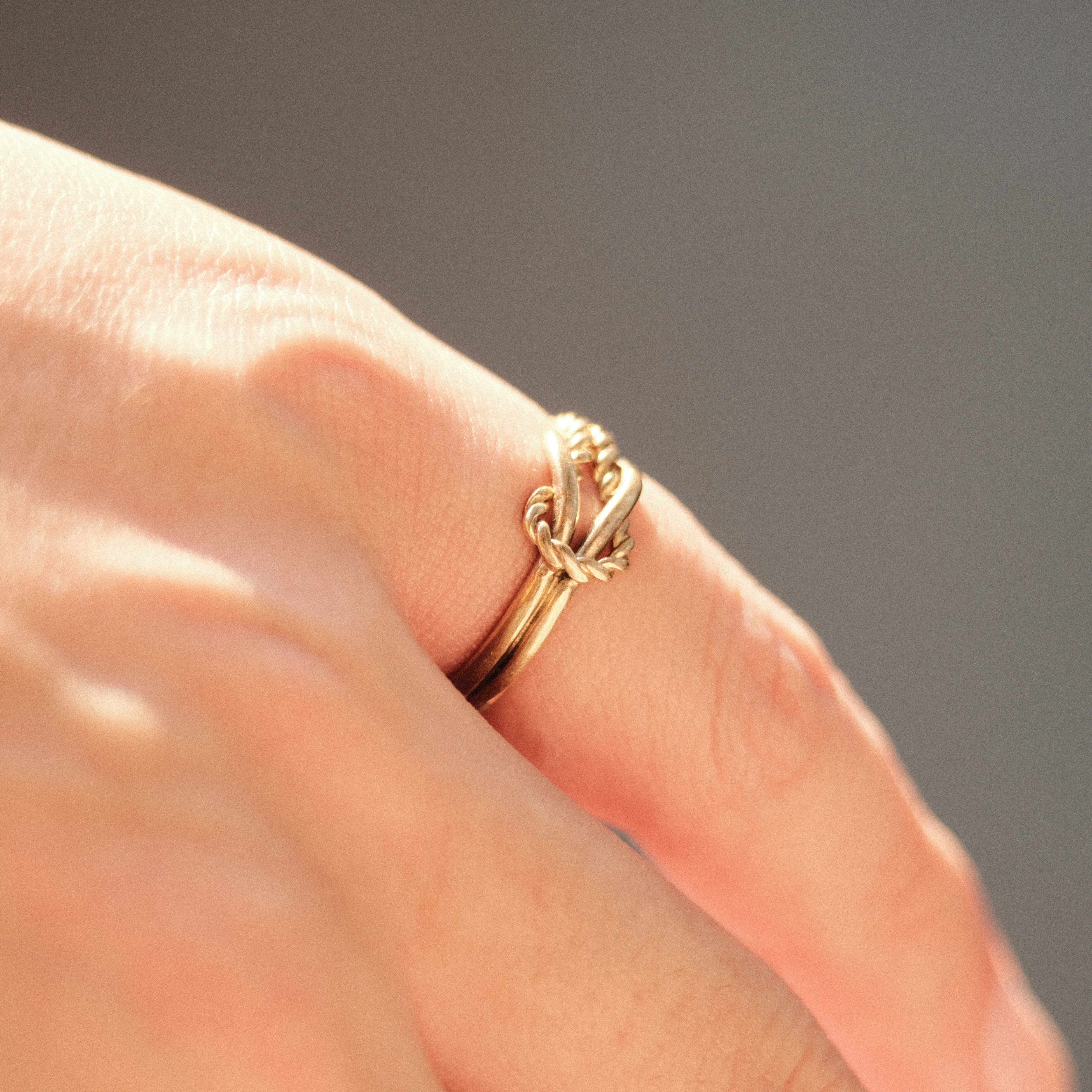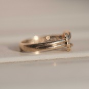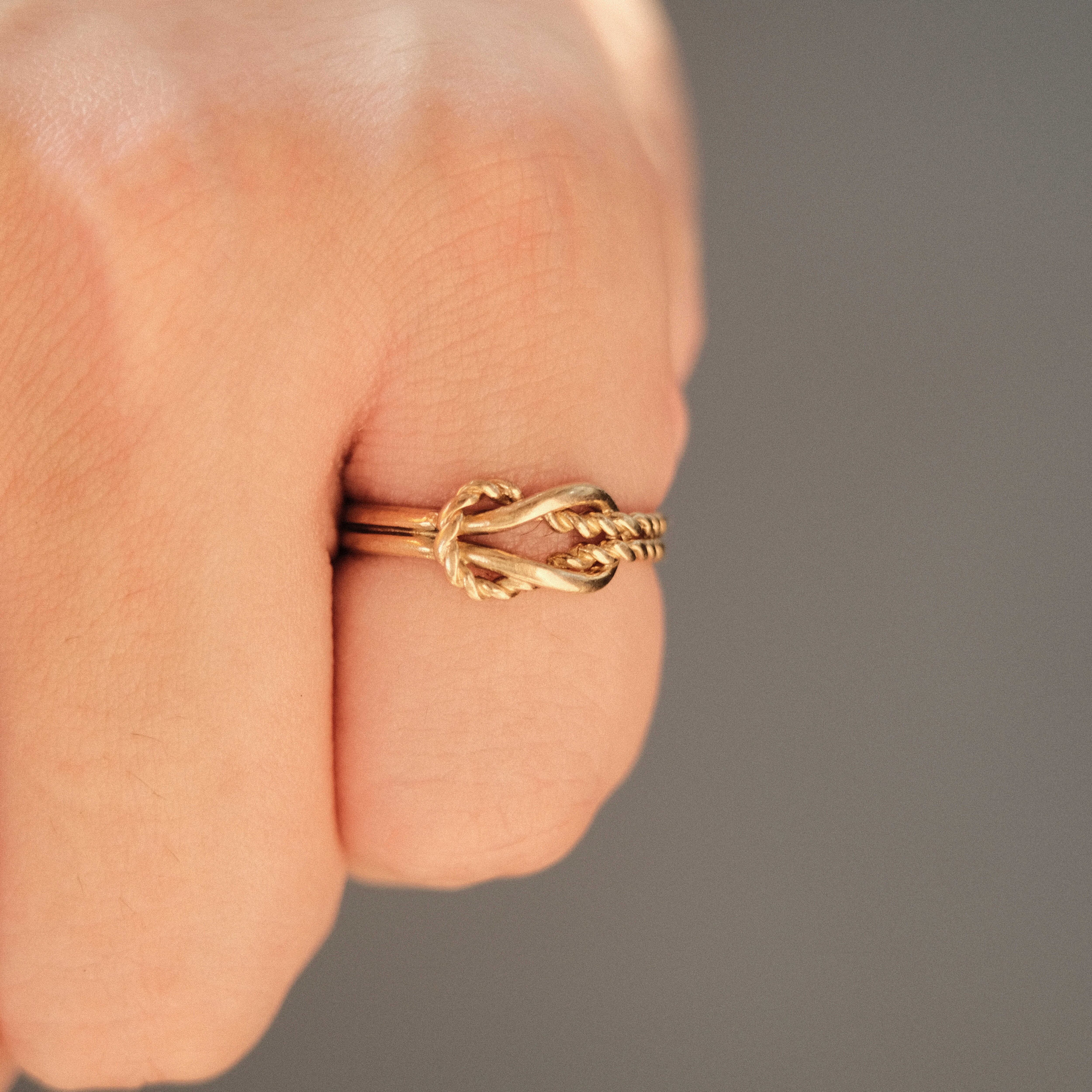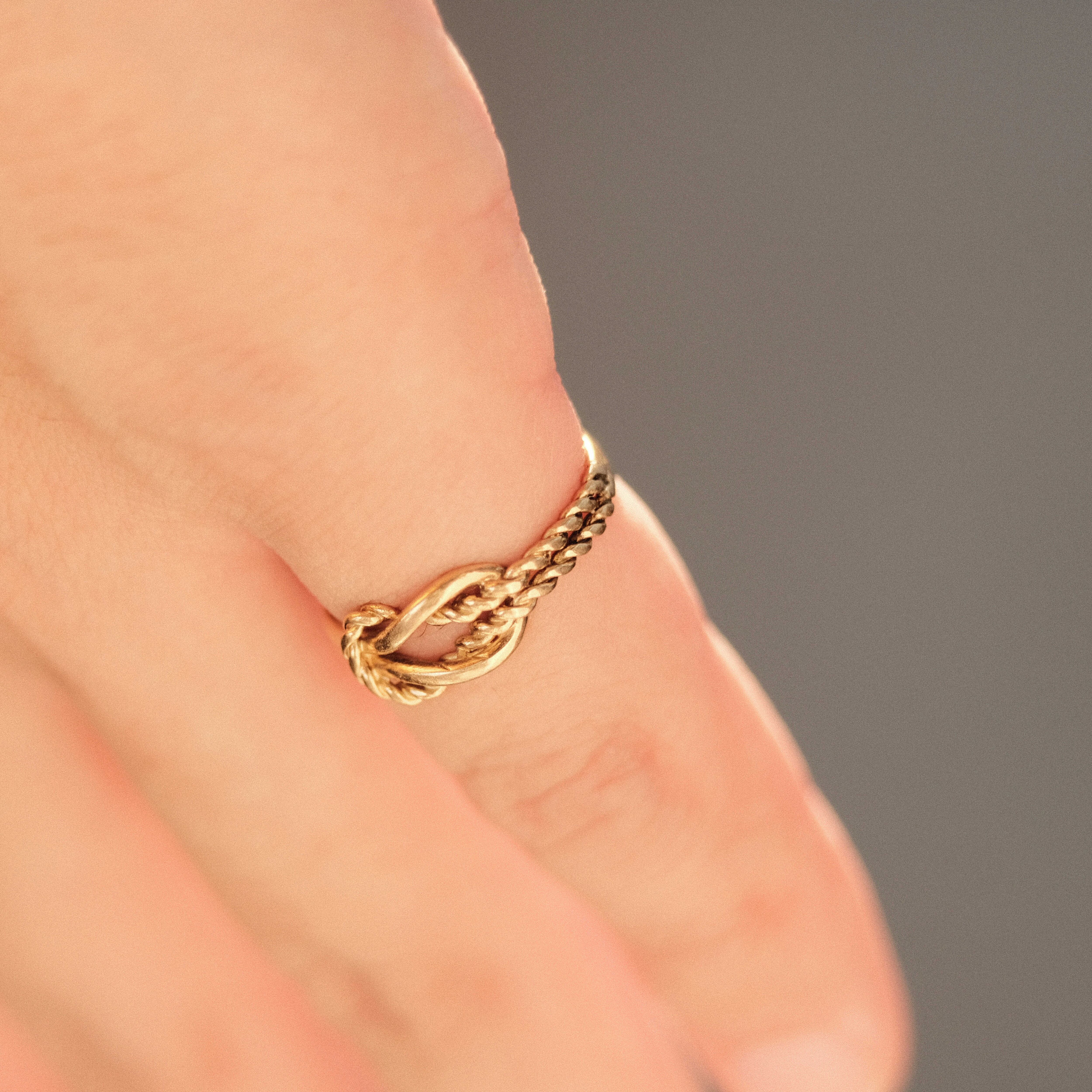 ノットデザインのリングを探してみるとふっくらとした立体的なシルエットのものやリング全体が網目の無いつるっとした表情のロープデザインのものなど、女性的なものが多いことに気づきます。そのような中この個体は味わい深くデザインに組み込まれた網目調のロープデザイン、高さの抑えられたバンドリングに近いシルエット、そしてヴィンテージゴールドの落ち着きと適度に渋みのある味わい深いトーン、これらが手を取り合い非常に珍しいユニセックスで魅力的な雰囲気を醸し出しています。