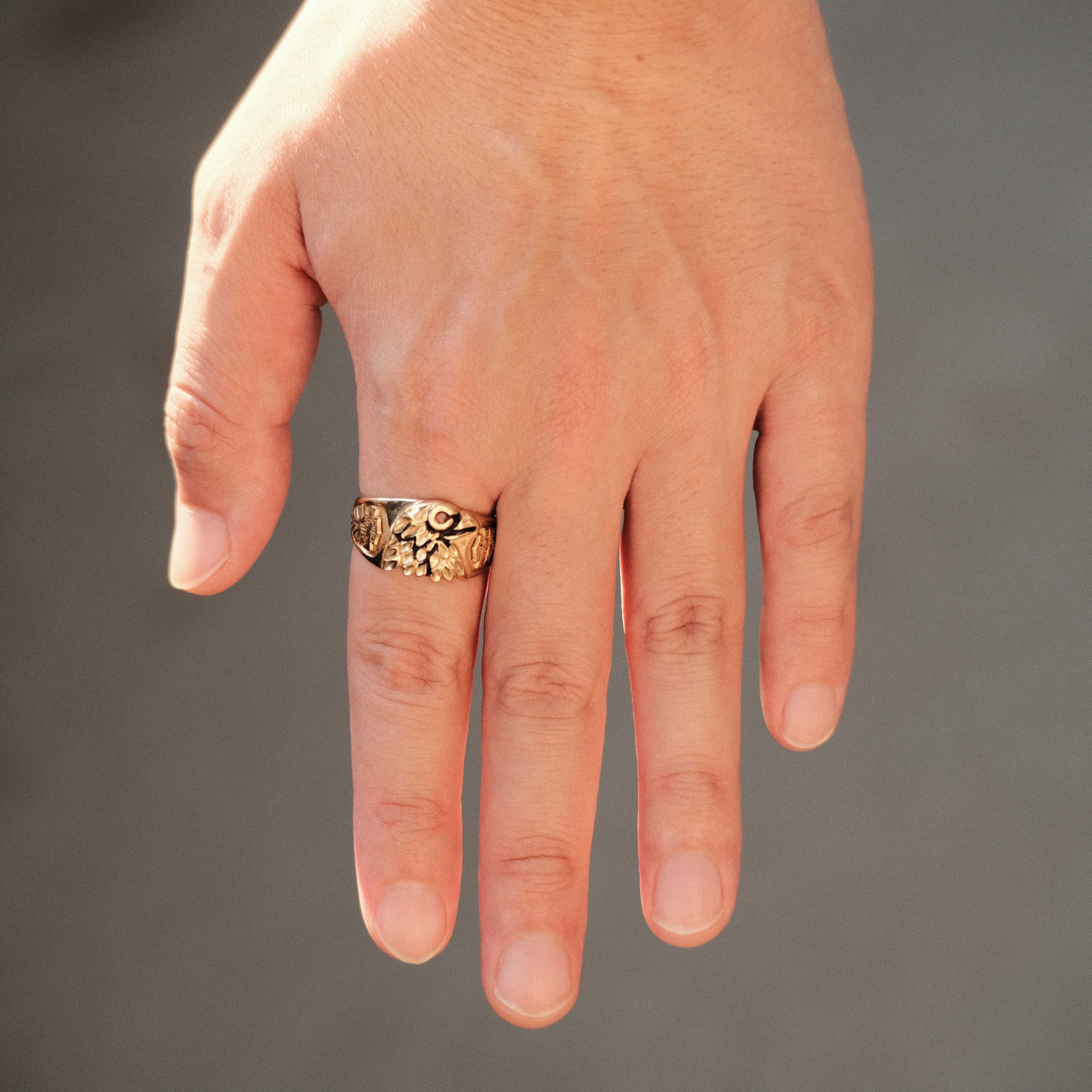 上記のようなイーグルの表情のおかげなのか、ヴィンテージジュエリーであるために放たれる「程よく枯れたオーラ」のおかげなのか、このような感覚で着用できる高重量のゴールドリングは非常に珍しく、独自の魅力を感じます。