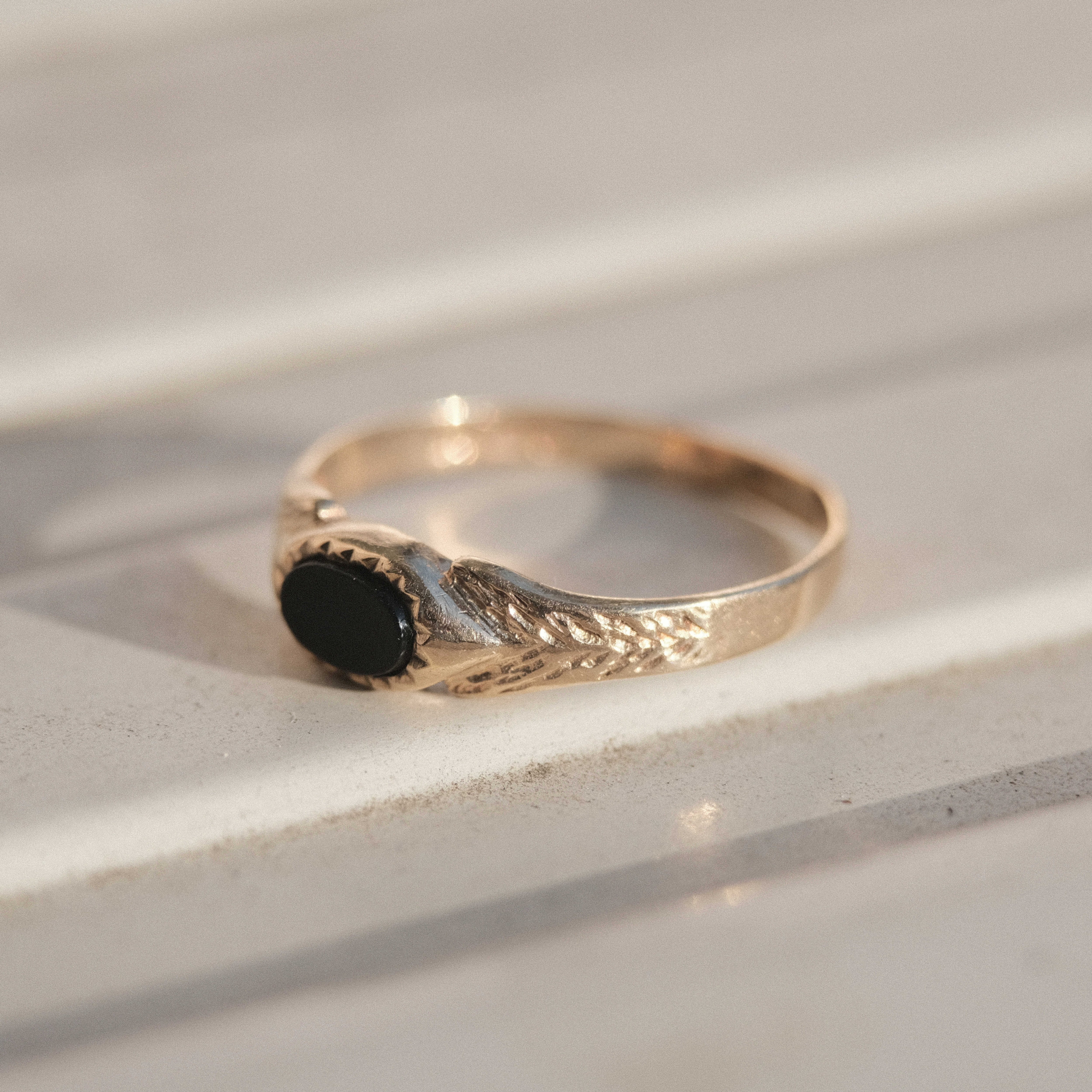 バンドリングともシグネットリングとも解釈できるシルエットがヴィンテージゴールドの味わい深いトーンとともに指先で上品に輝きます。トップ部分には草木を思わせるような有機的美しさを放つ刻印に囲まれるようにしてオーバル型のオニキスがセッティングされています。