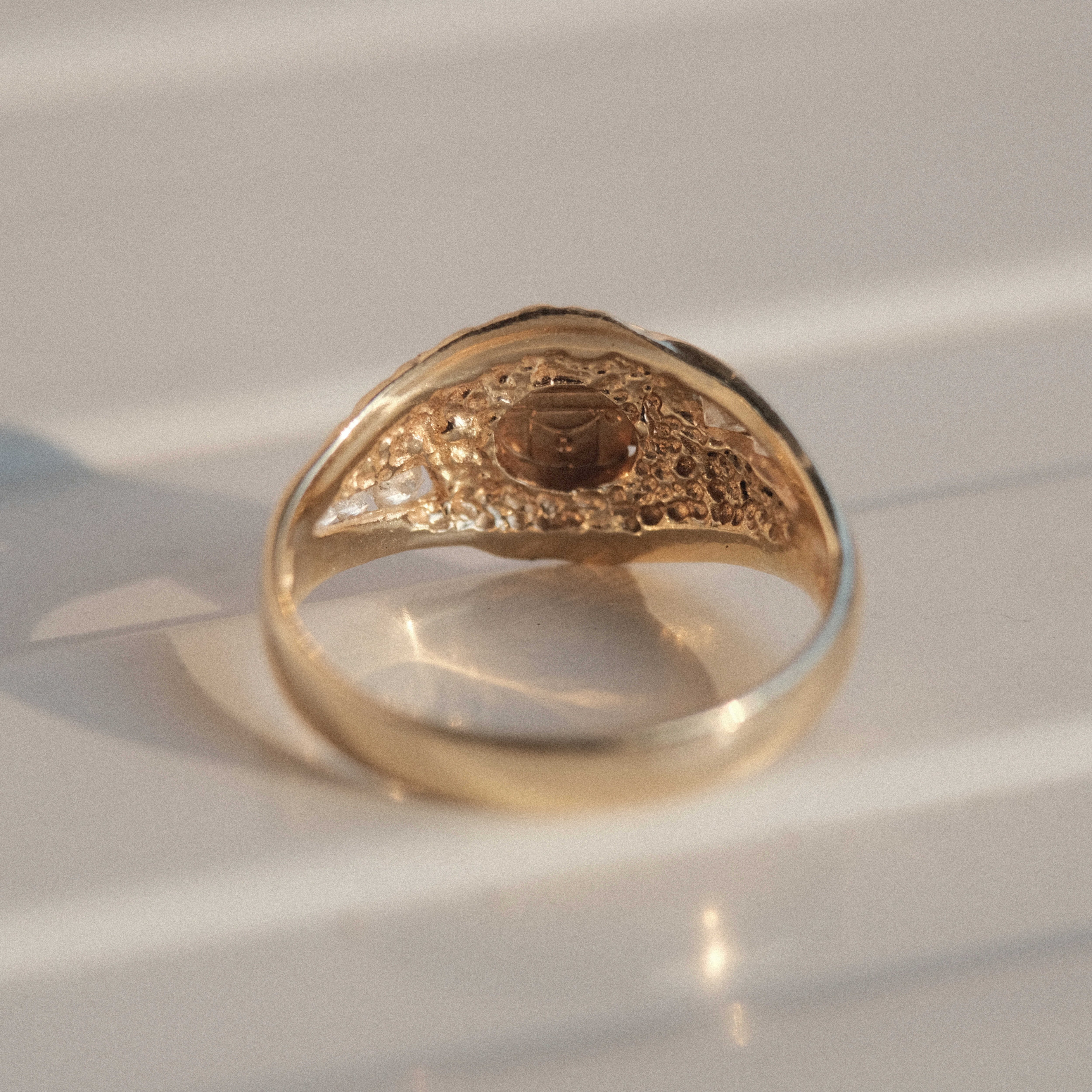 曲線上に設置されたダイヤモンド、サイズ感と形状が「可愛らしい」印象のエンブレム、プレーンな質感とナゲットデザイン部の無造作な印象のミックス、これらのディテールにより、ゴージャスでありながら「抜け感」のあるリングに仕上げられています。
