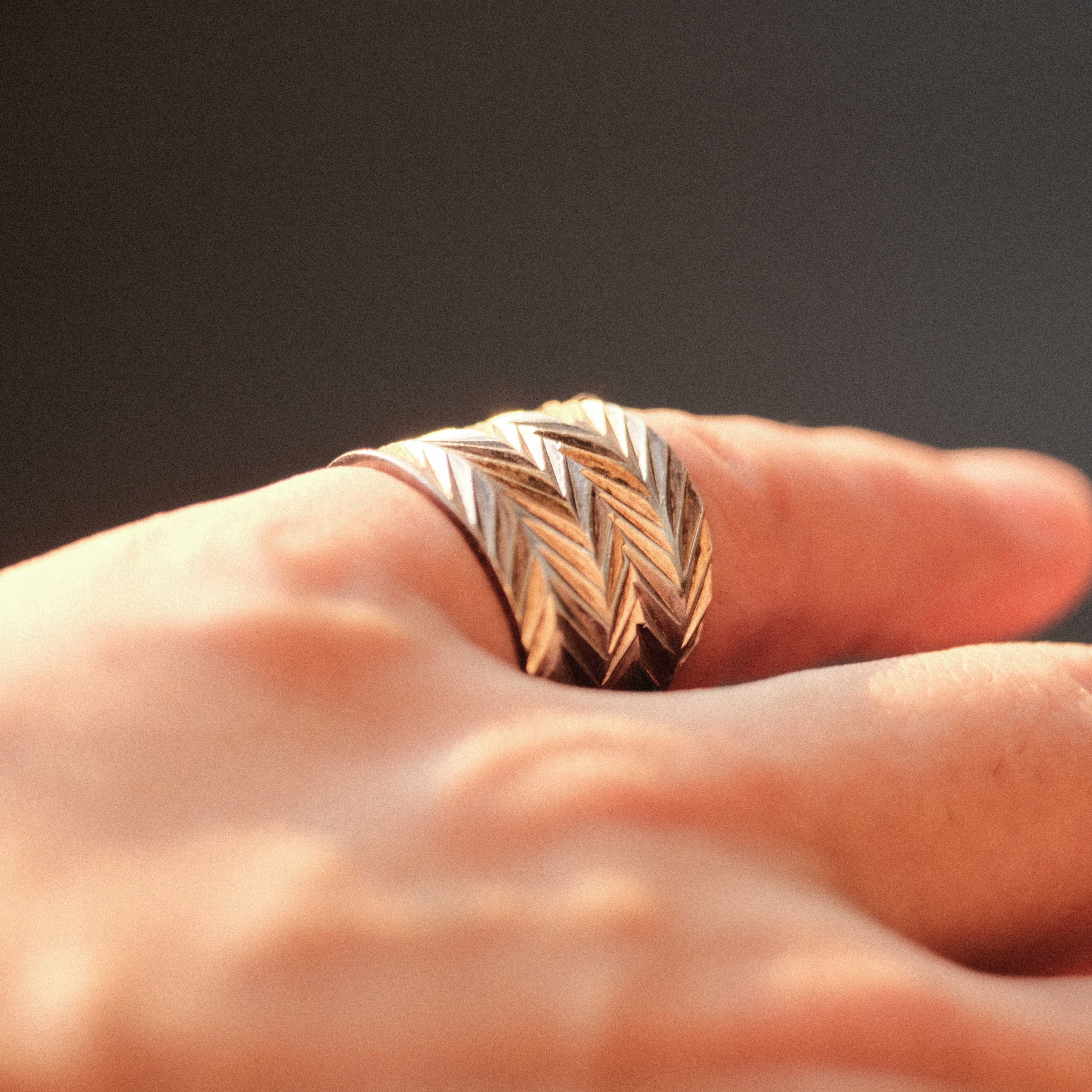 味わい深くエイジングしたシルバーの中で矢じりを思わせるような輝きを放つ様は、一度着用してみると個性的でインパクトはありながらも「昔から愛用していたリングのようにコーディネートの中で馴染む」ような独特の魅力を感じていただけるかと思います。