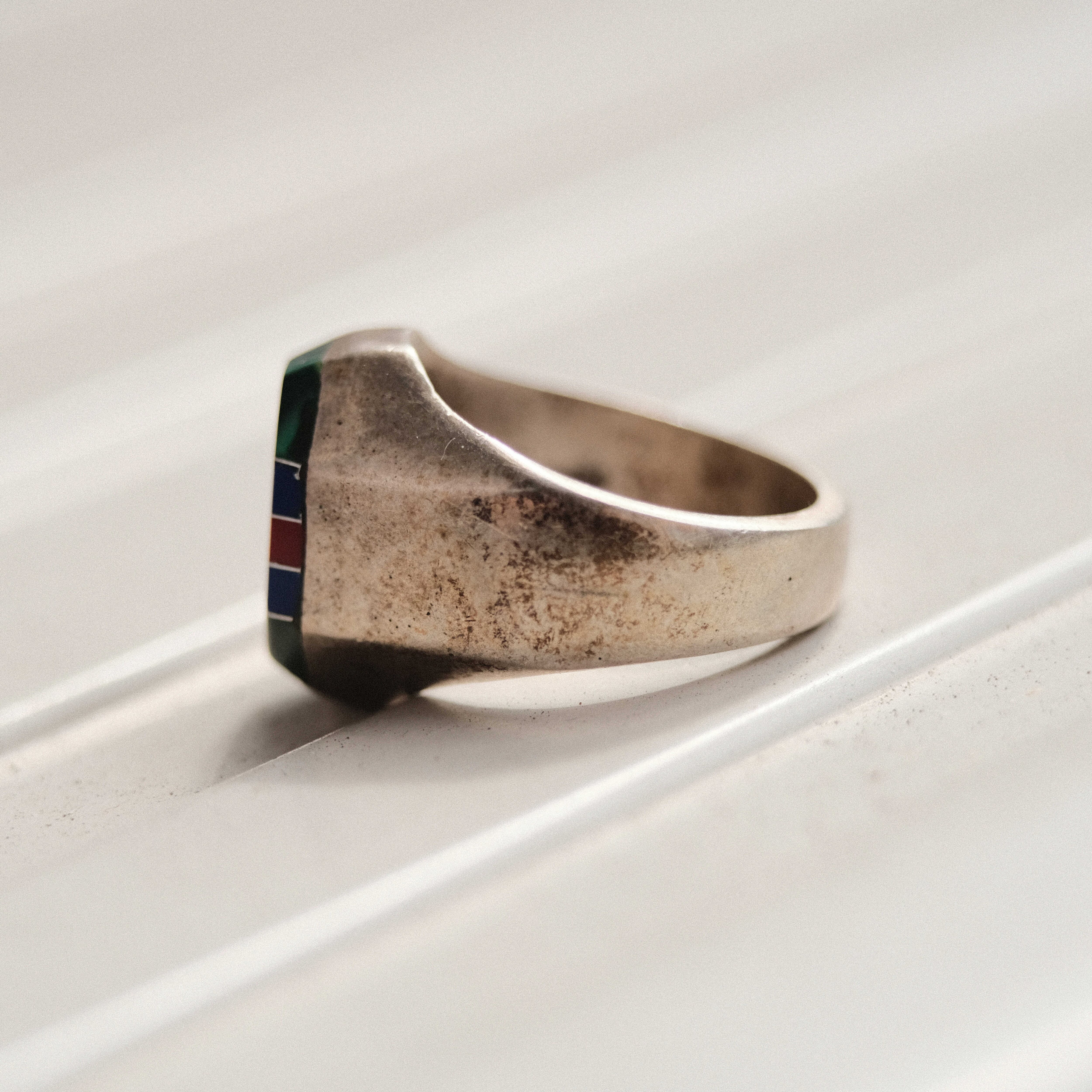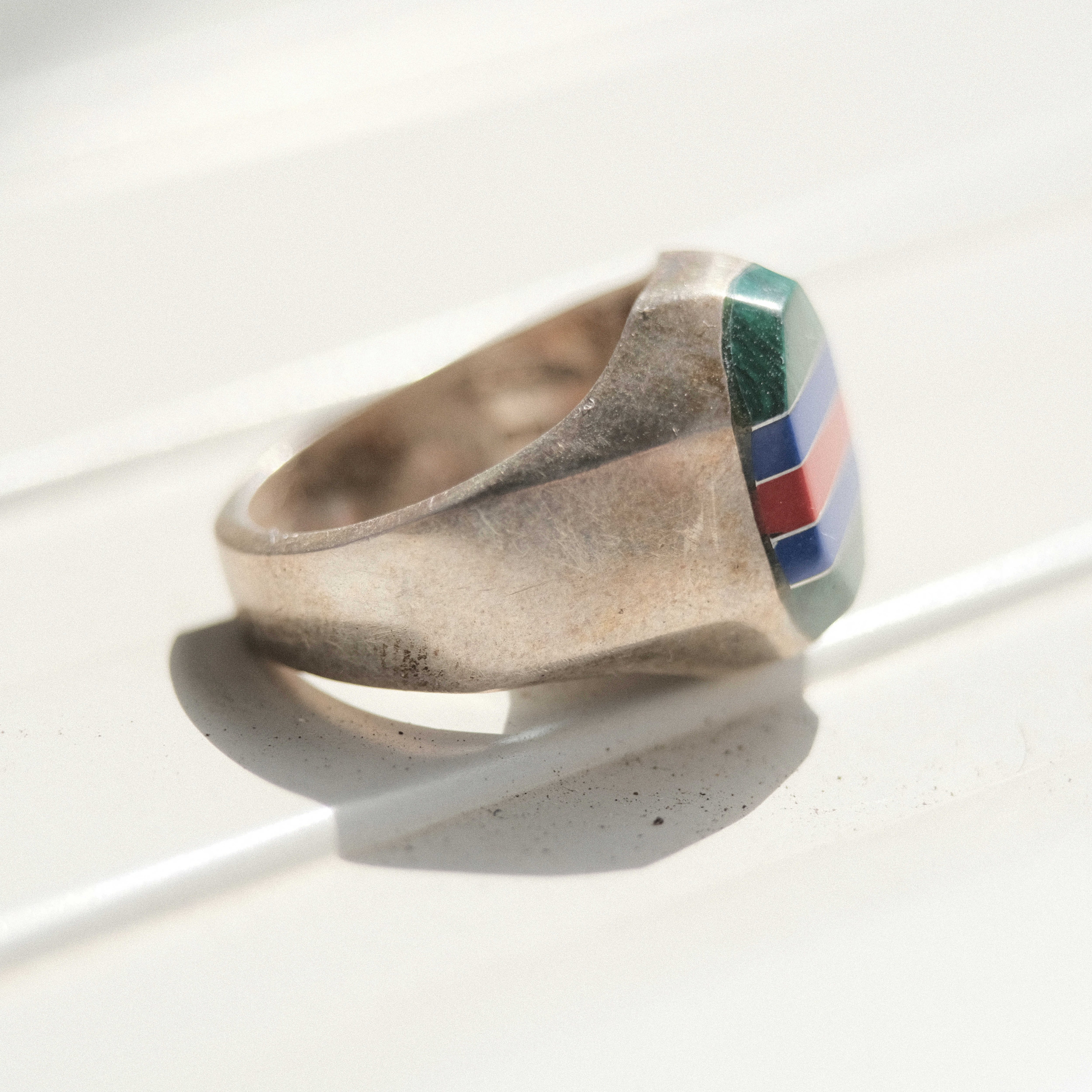 メキシカンジュエリーやバイカーリングの空気感の漂う複数のストーンが滑らかにインレイセッティングされています。エイジングによるヴィンテージトーンのシルバーもとても渋く美しい雰囲気を放っています。