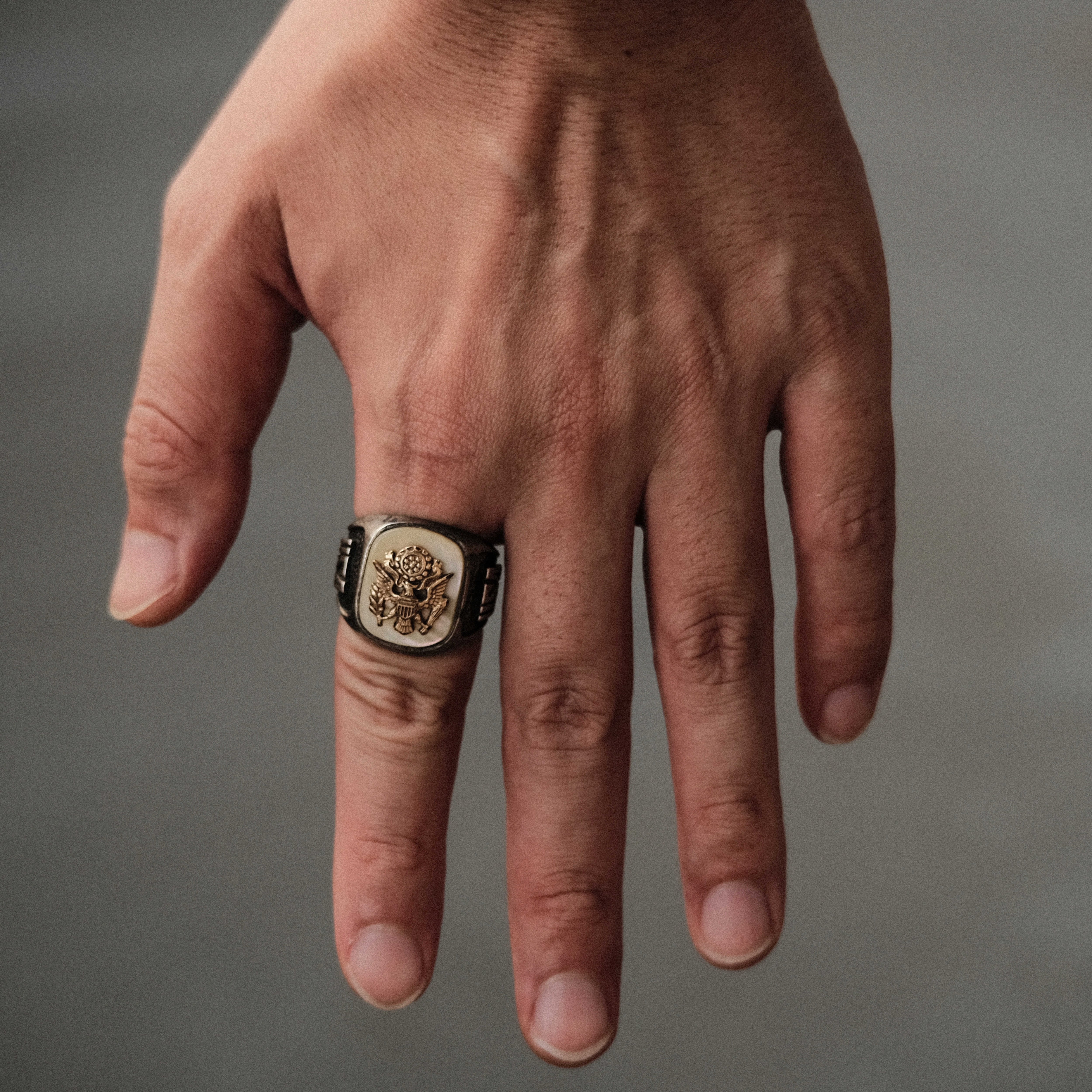 ヴィンテージシルバーボディーと当時モノのUSアーミーデザインの醸し出す力強さとパールの優しい印象によるコントラストが非常に心地よいジュエリーであり、指先で唯一無二のオーラを放ってくれます。