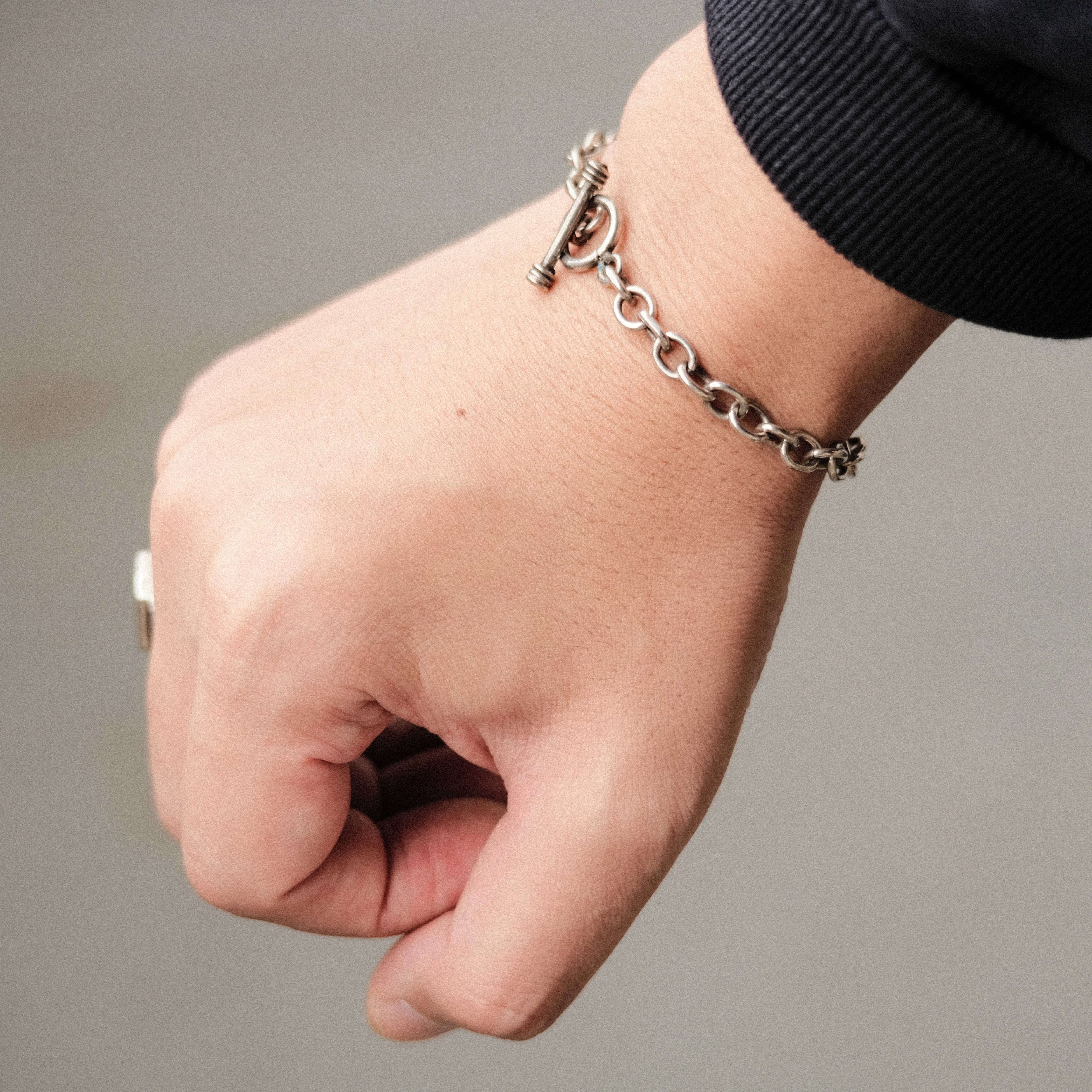 エイジングにより味わい深い雰囲気のあるシルバーにトグルデザインとヴィンテージエルメスやオールドティファニーらしさを感じる個性的なブレスレット。