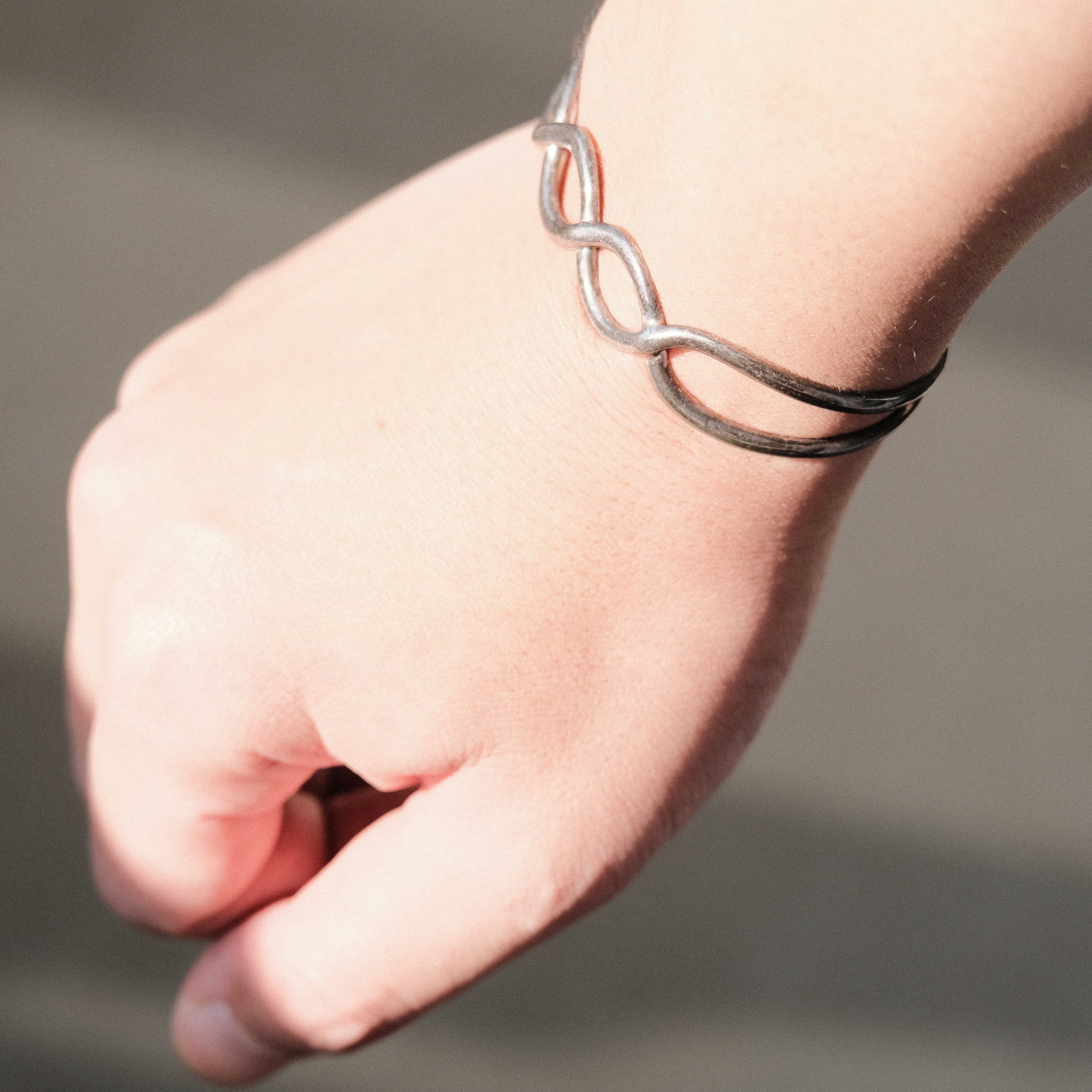 手首に乗せた際の印象としてはトライバルな味わい深い空気感はもちろんのこと、どこかドレス感のある空気を感じます。余白を大切にしたデザインによるものなのか、それとも計算されたボリューム感によるものなのかもしれません。