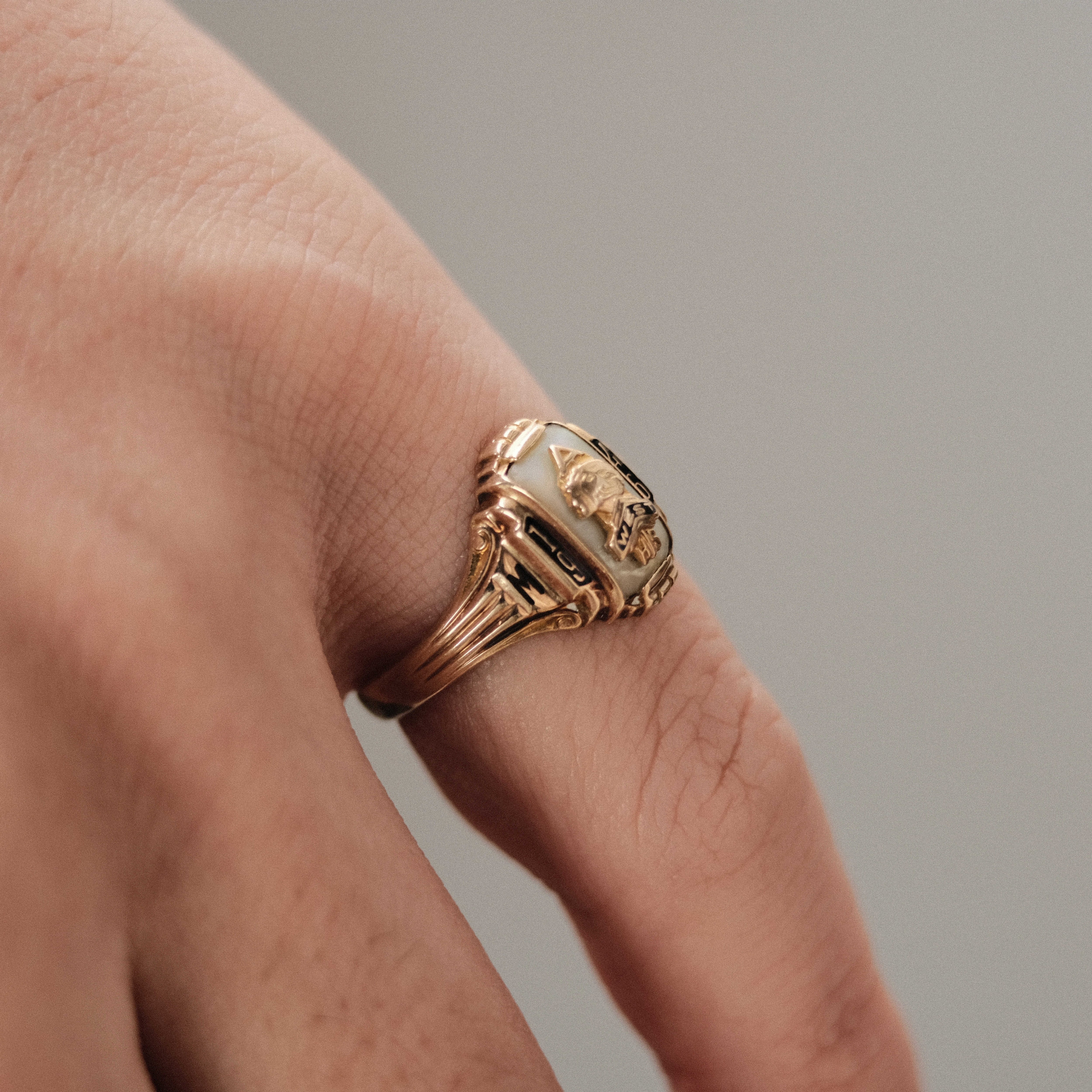 パールとゴールドが喧嘩をすることなく、グラデーションというような感覚で手を取り合って独特の融合的美しさをクラスリングという枠の中で放つ様は他のジュエリーでは味わうことのできない視覚的高揚感を感じさせてくれます。