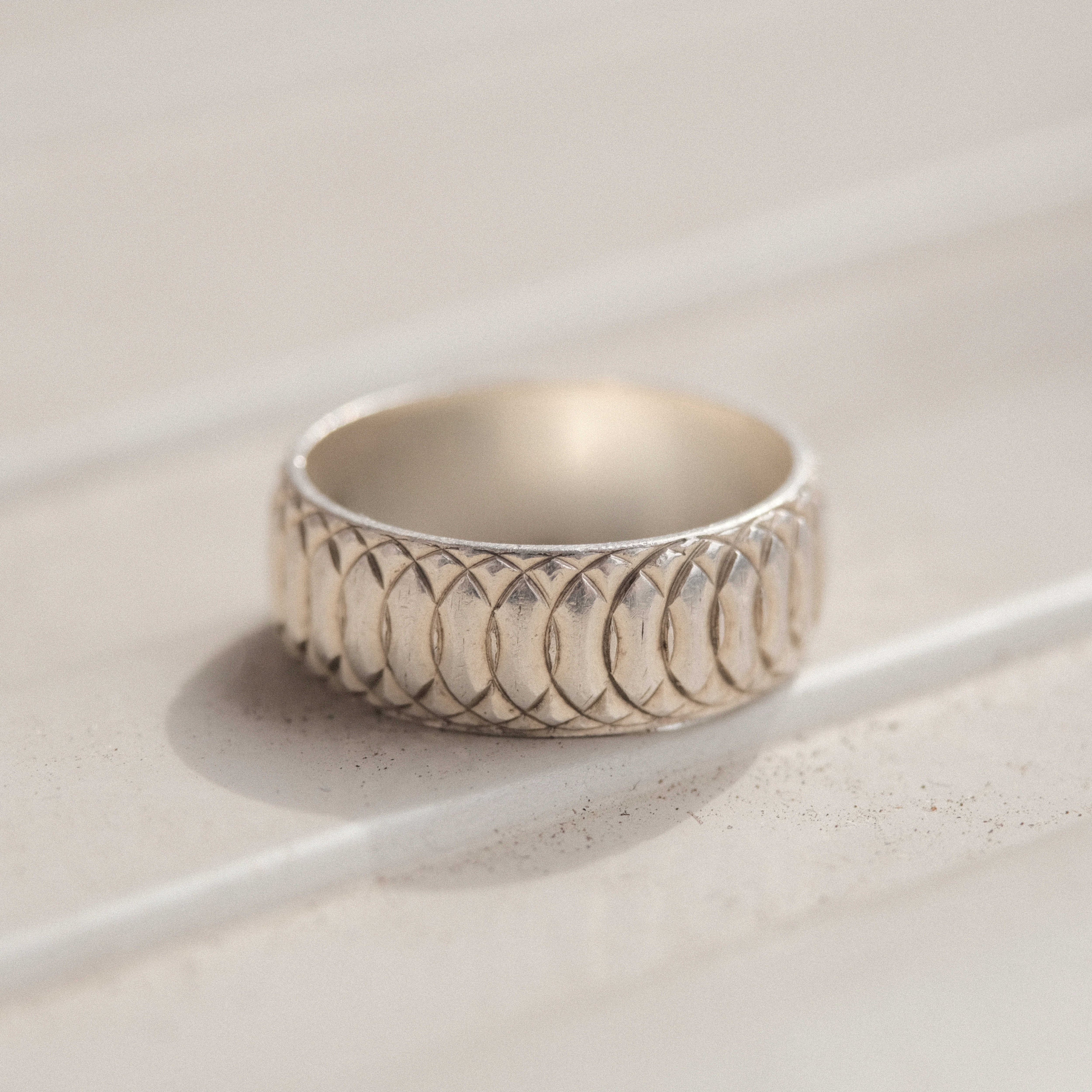 エイジングにより雰囲気の出ているシルバーボディーに無数の楕円形彫刻が重ね合わせられバンドを一周している個性的なデザイン。指を傾けた際に光を反射し輝く連なる円形デザインが唯一無二の表情を見せてくれます。くすんだシルバーの適度なカジュアル感と彫刻デザインのドレス感のバランスがファッション的に強い魅力を放つアイテムでもあります。