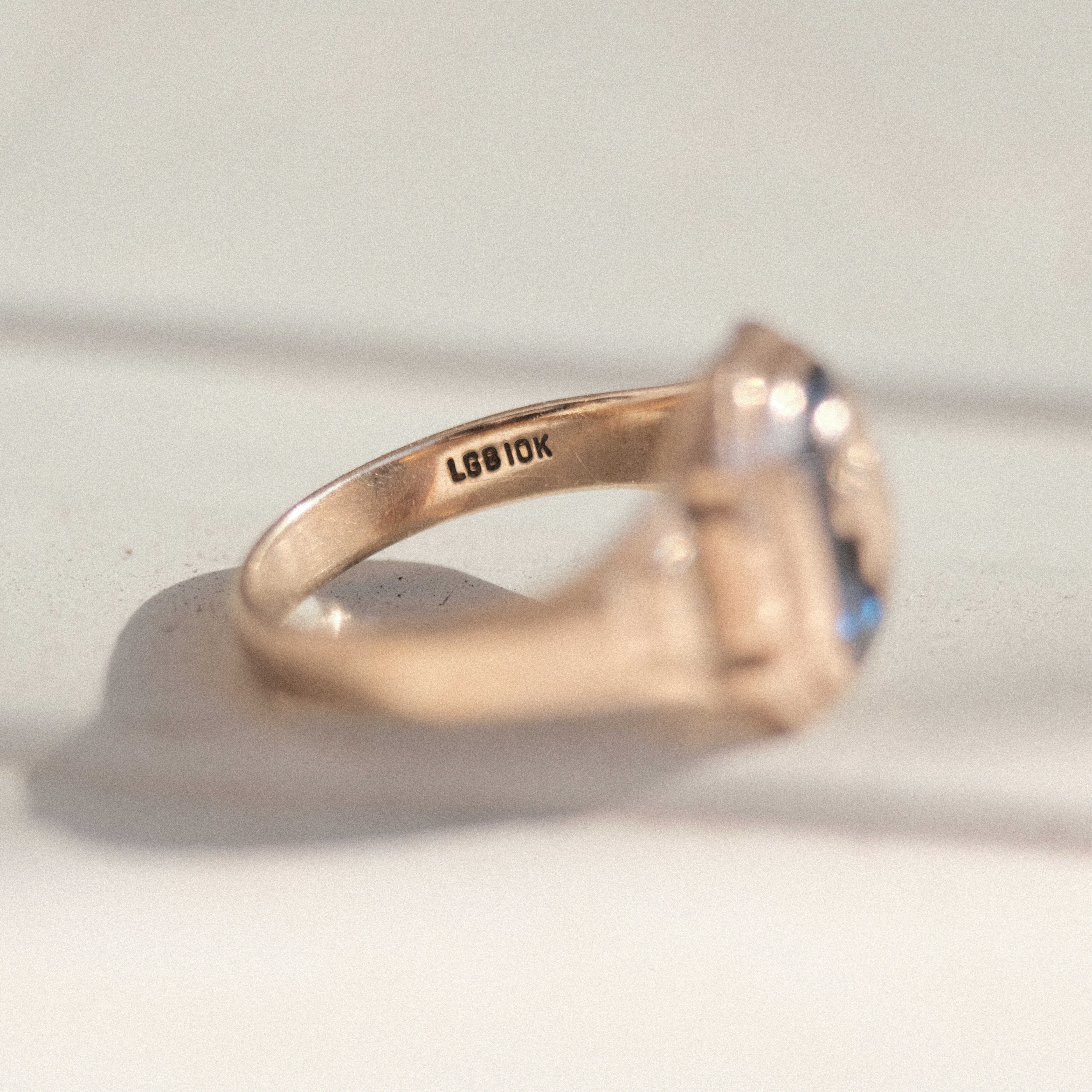 いざ探してみるとその珍しさに気づく正方形に近いスクエアデザイン。柔らかさと個性のあるヴィンテージイエローゴールドにブルーカラーのクリアストーンがセッティングされたその佇まいは、より個性的でカジュアルなカクテルリングといった印象です。