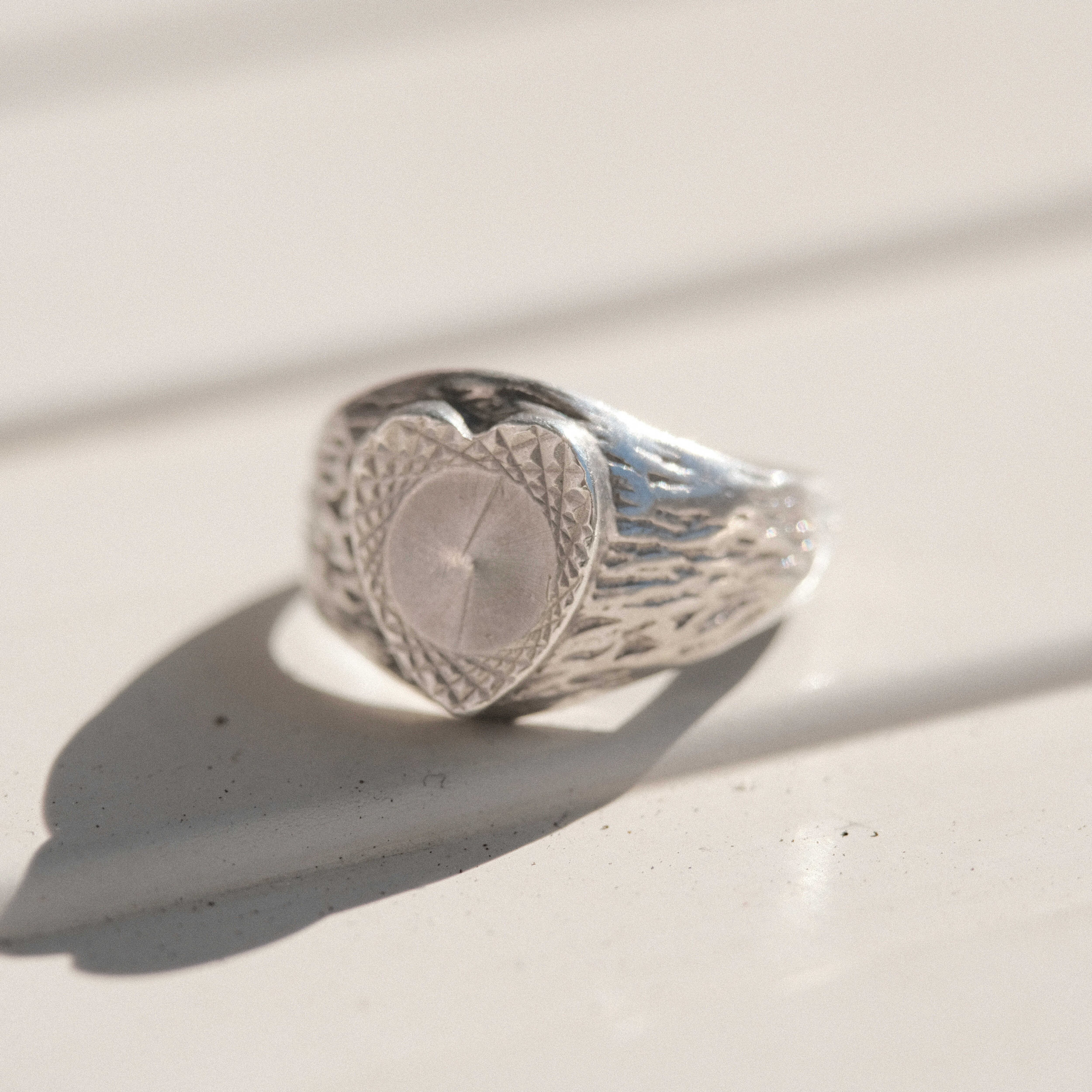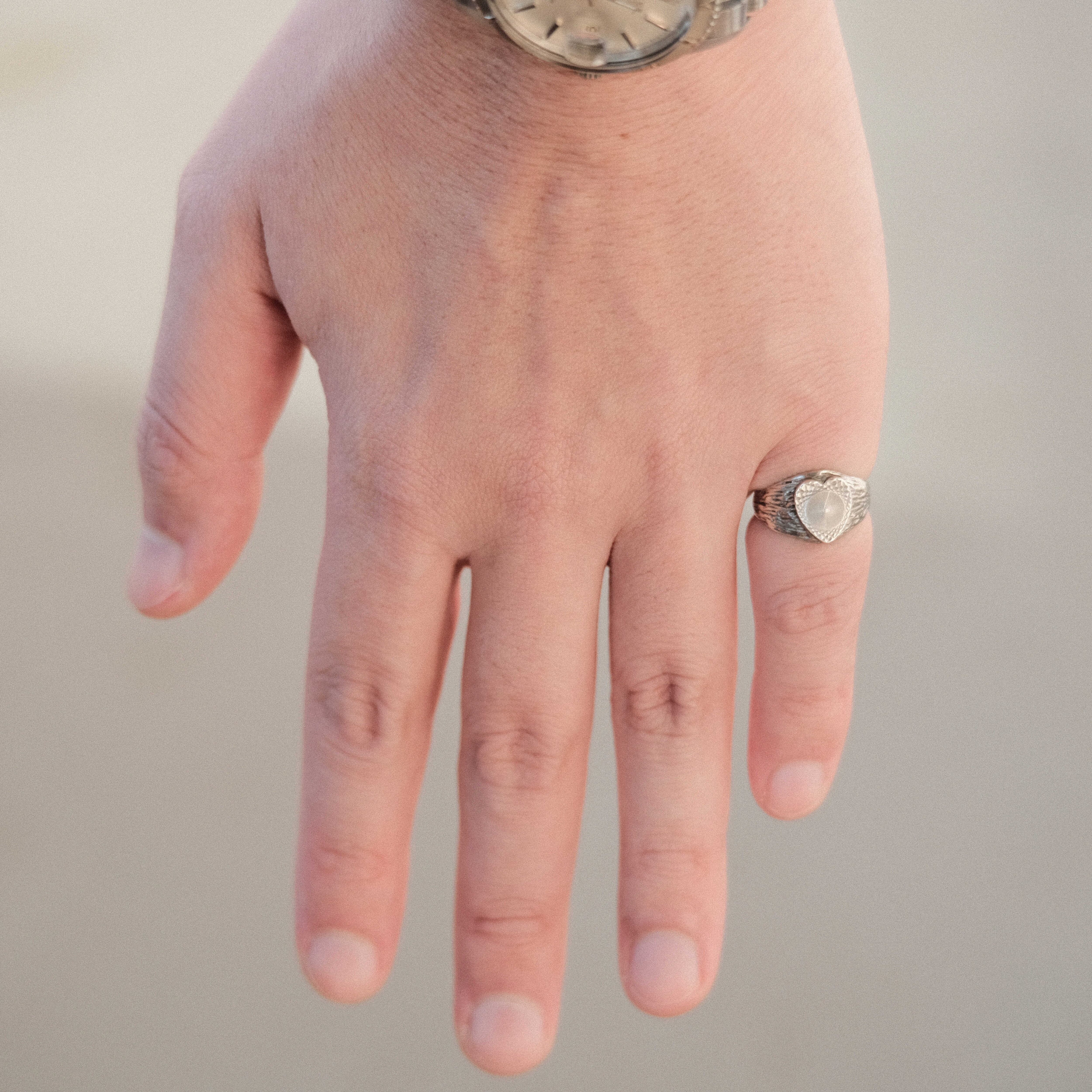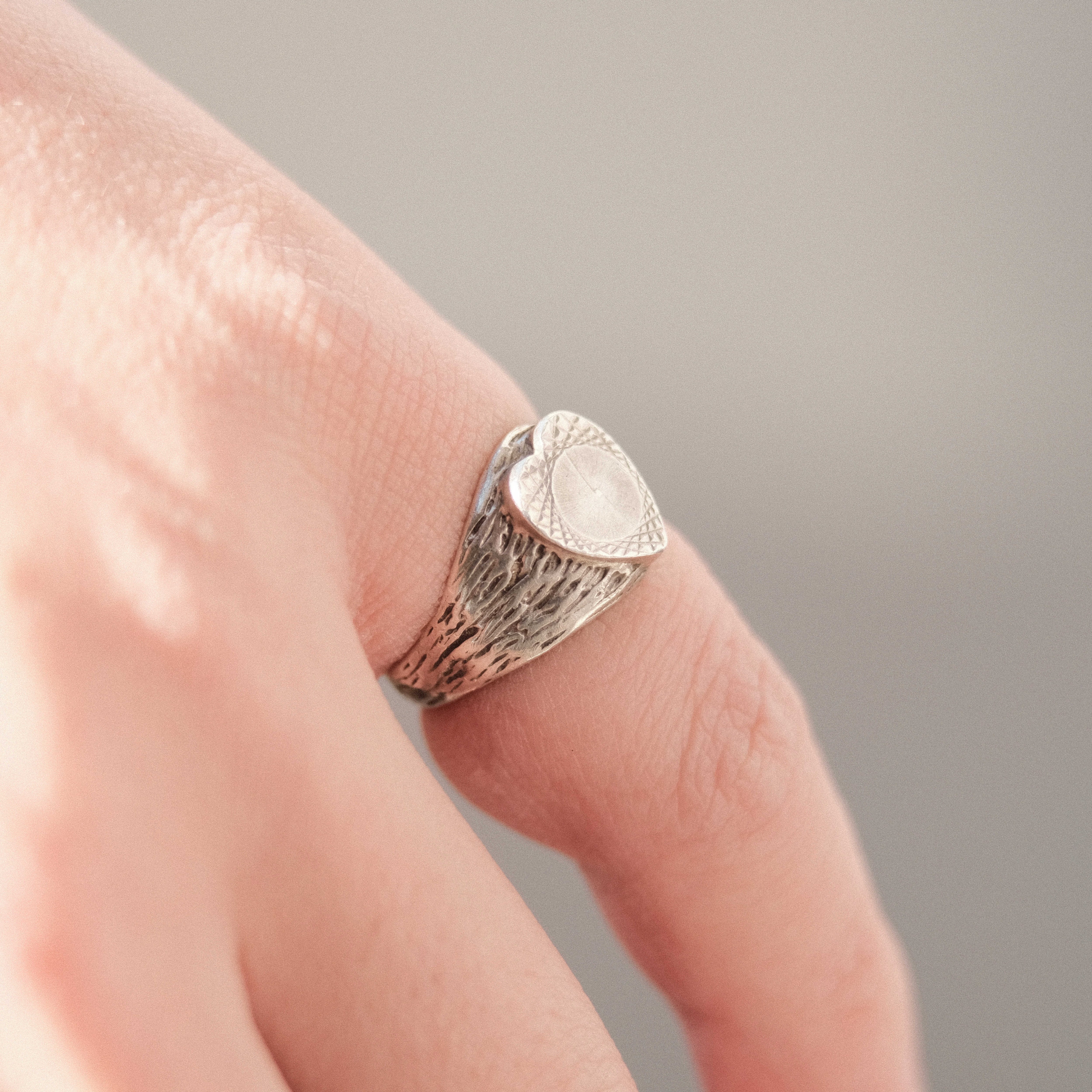 ハートデザインのシルバーシグネットリングはそれなりに見かけることがありますが、この個体はシルバーの色味と質感、デザインから更なる深みを感じられるピースです。