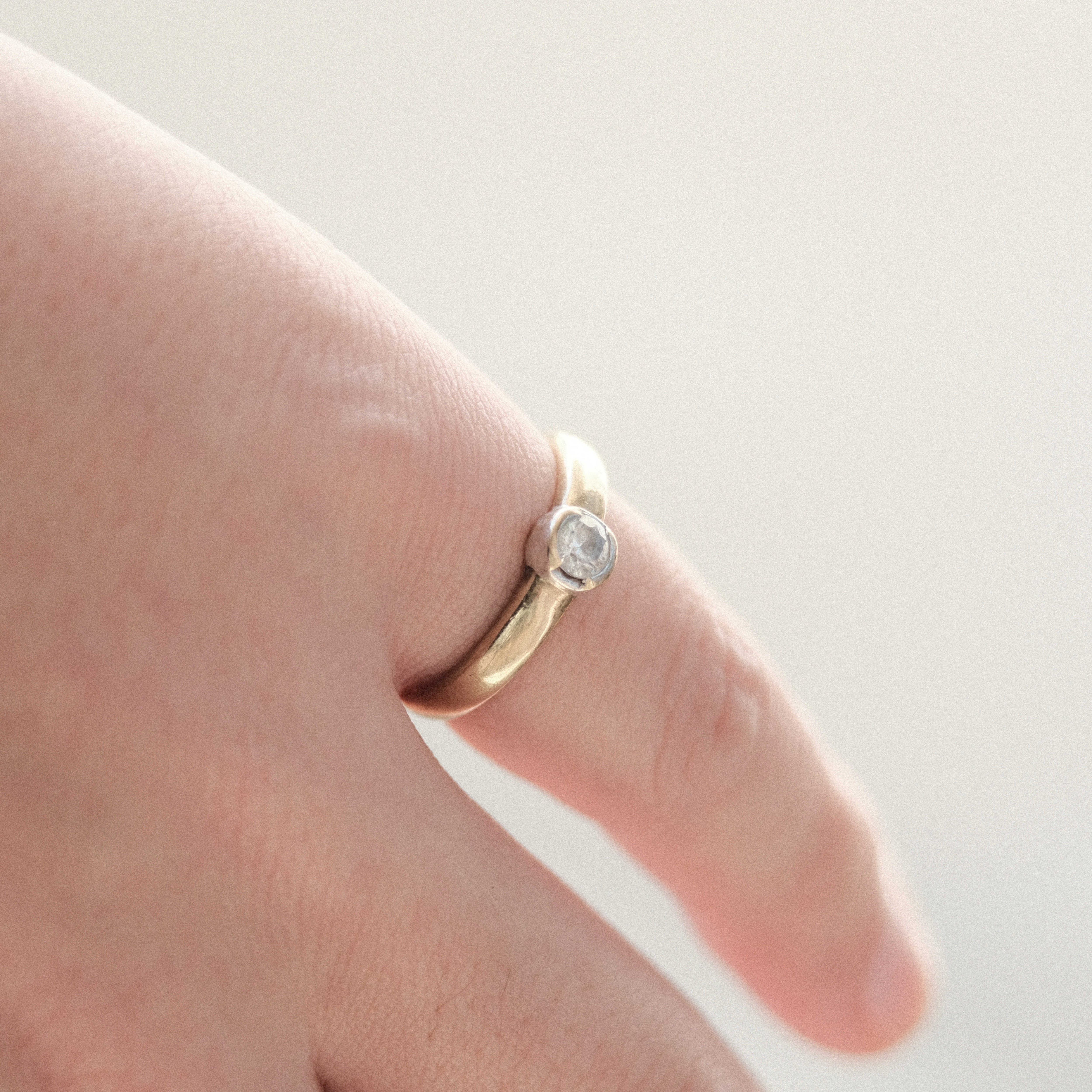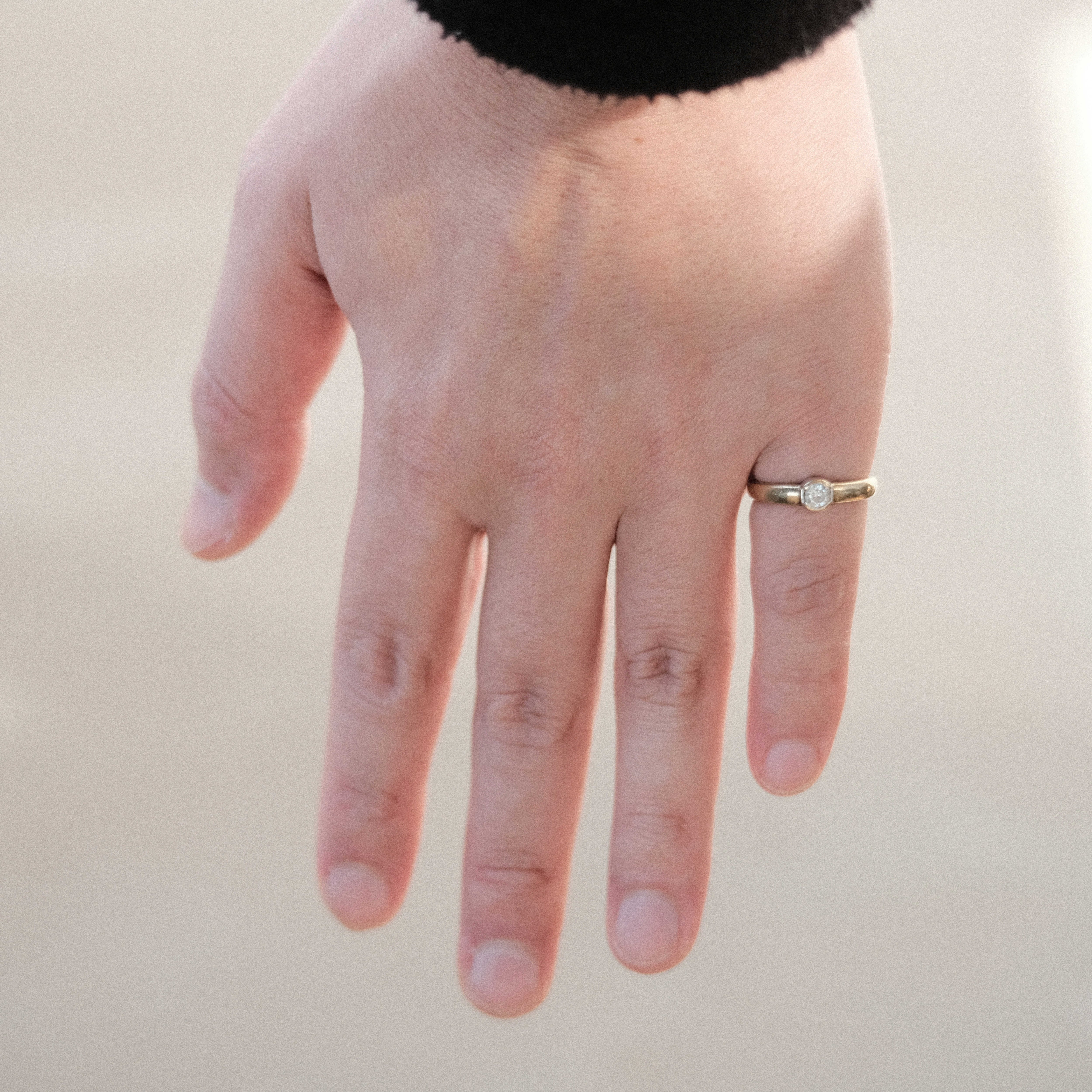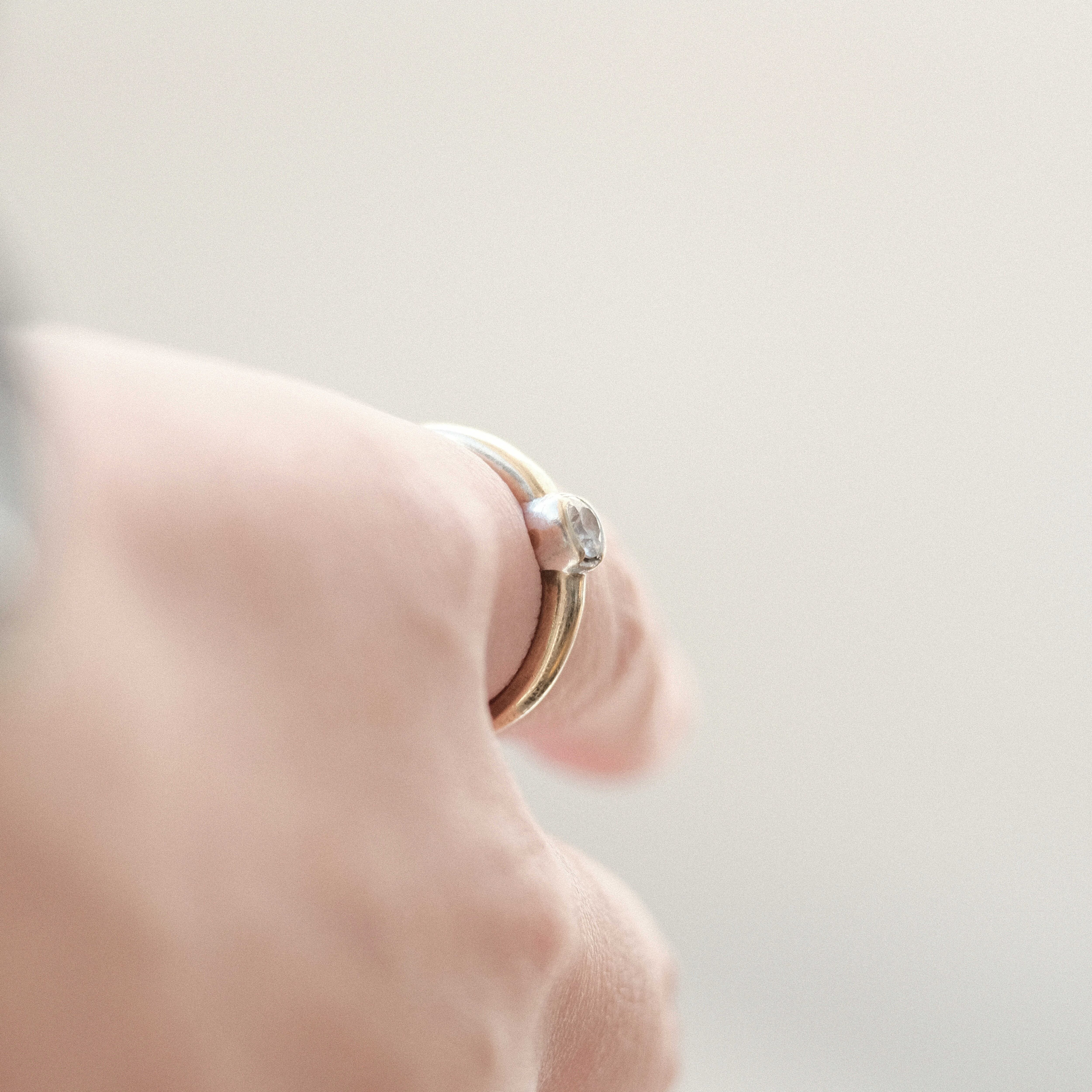 サイドから眺めた際にトップ部分の高さが抑えられており、よりカジュアルに楽しめる雰囲気のあるソリティアリングである点もポイントが高いかと思います。