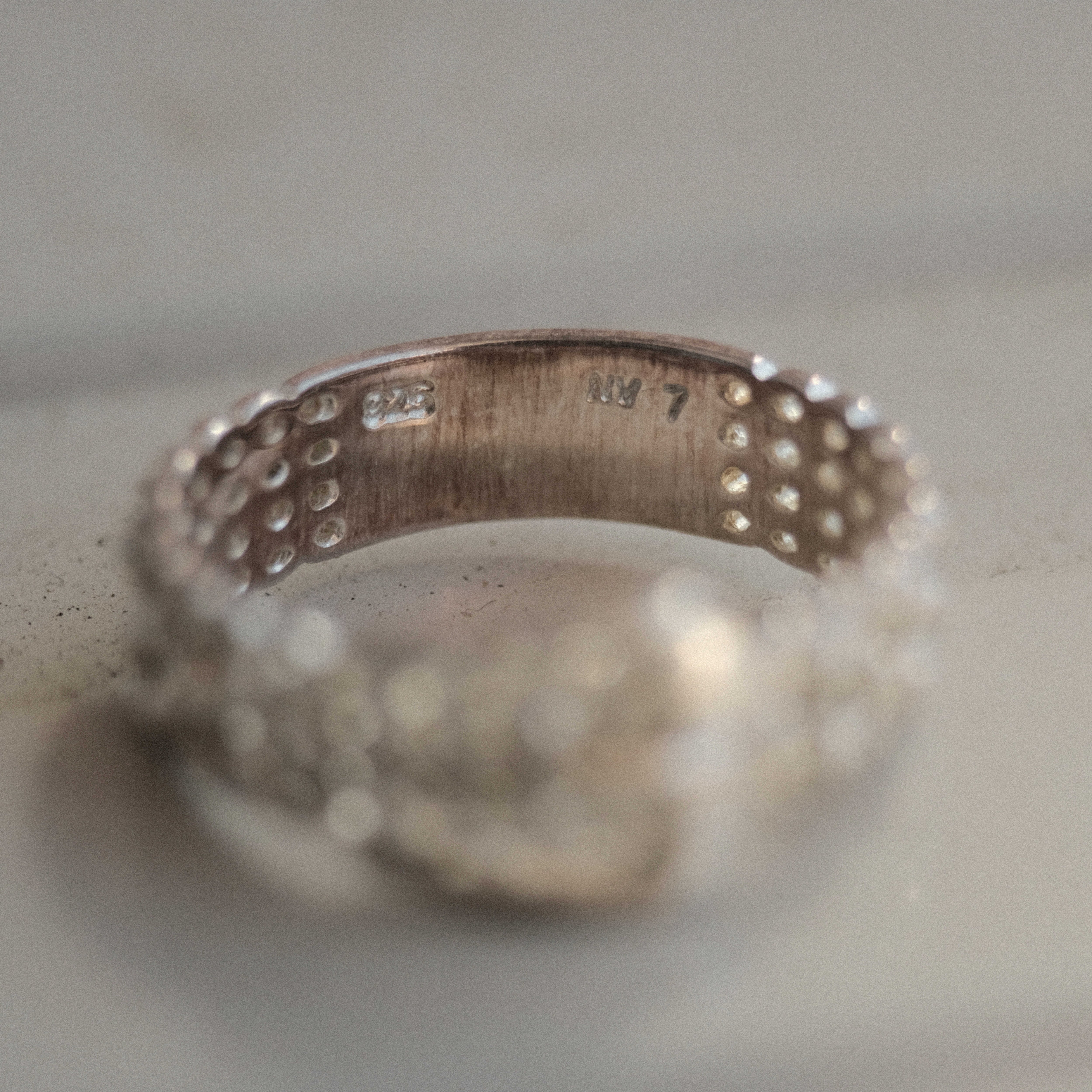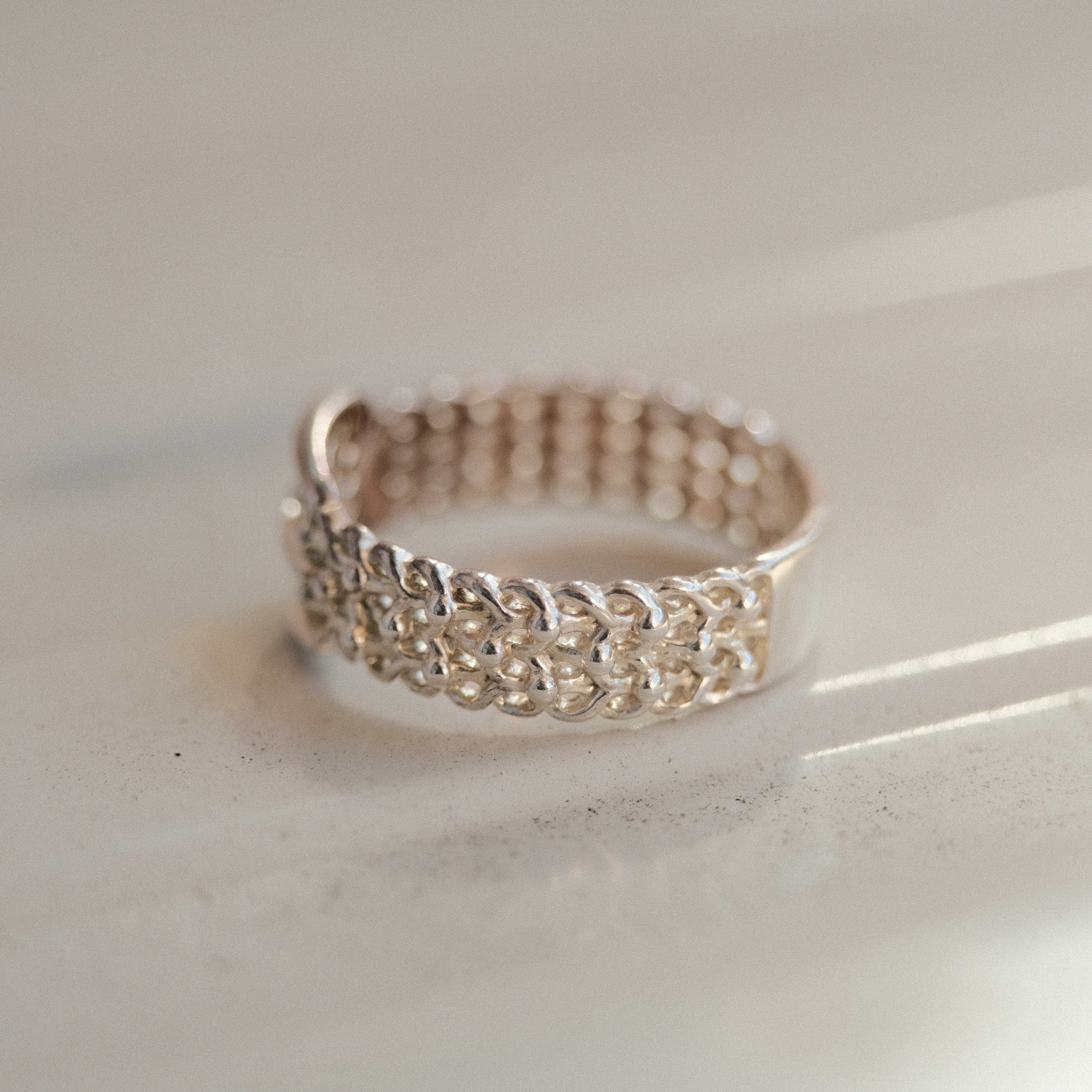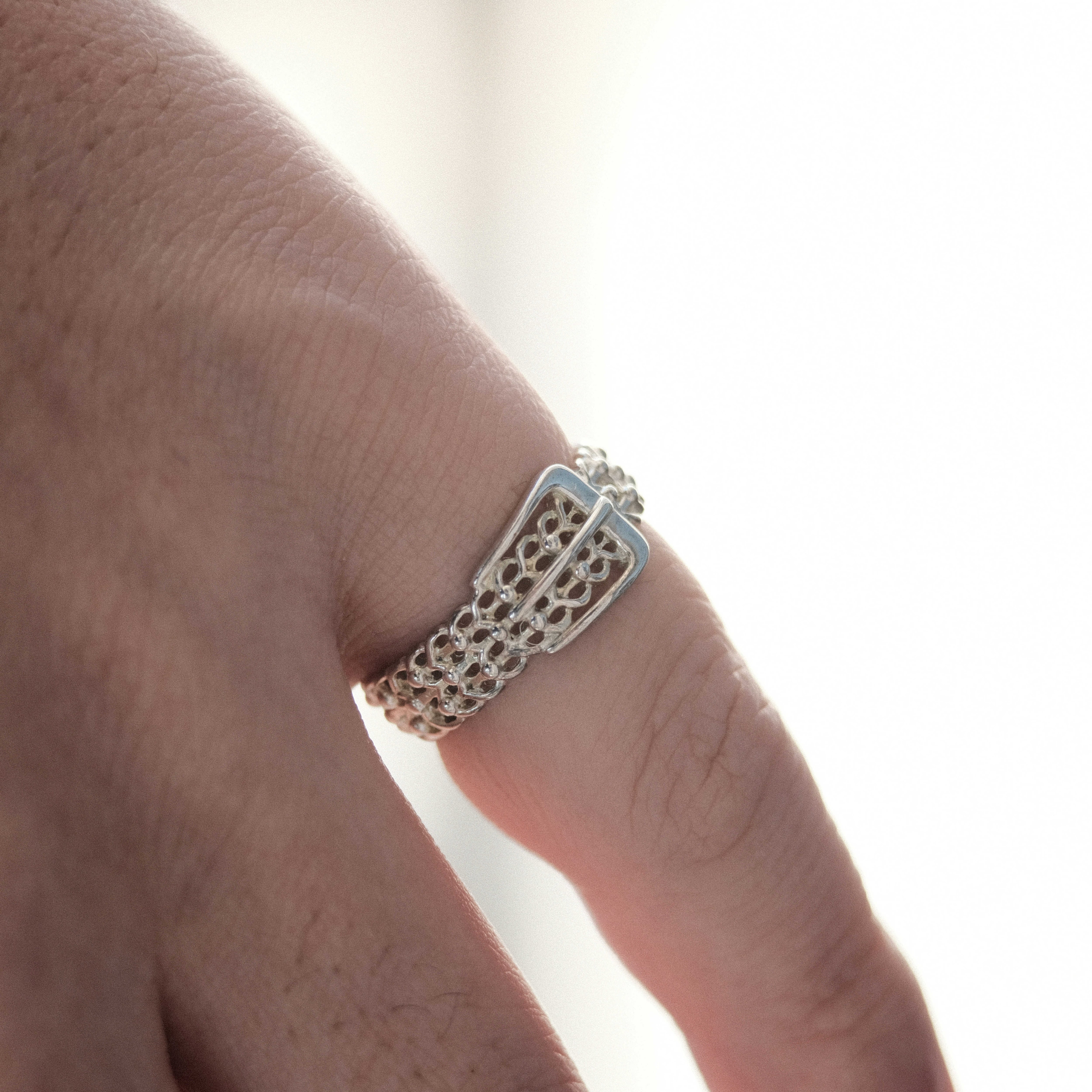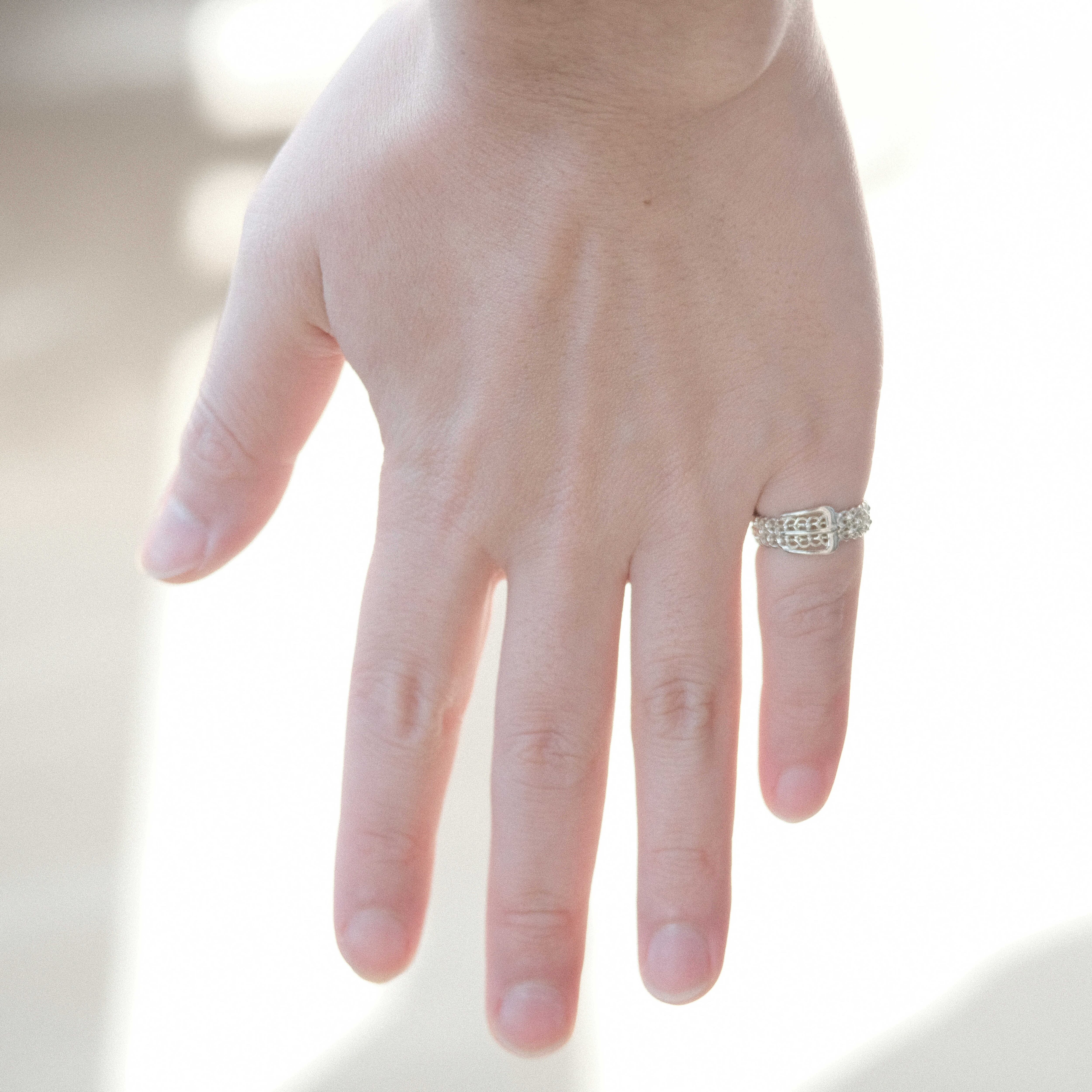 くすみが少なく上品な雰囲気を放つ白みの強いシルバーと、センスの光るボリューム感のベルトデザインが個性的かつエレガントな表情を指先で見せてくれます。バンド部分はほんのりとゴシックな空気感のあるデザインでどこかクロムハーツのようなインパクト感がリング全体に心地よい力強さを与えています。