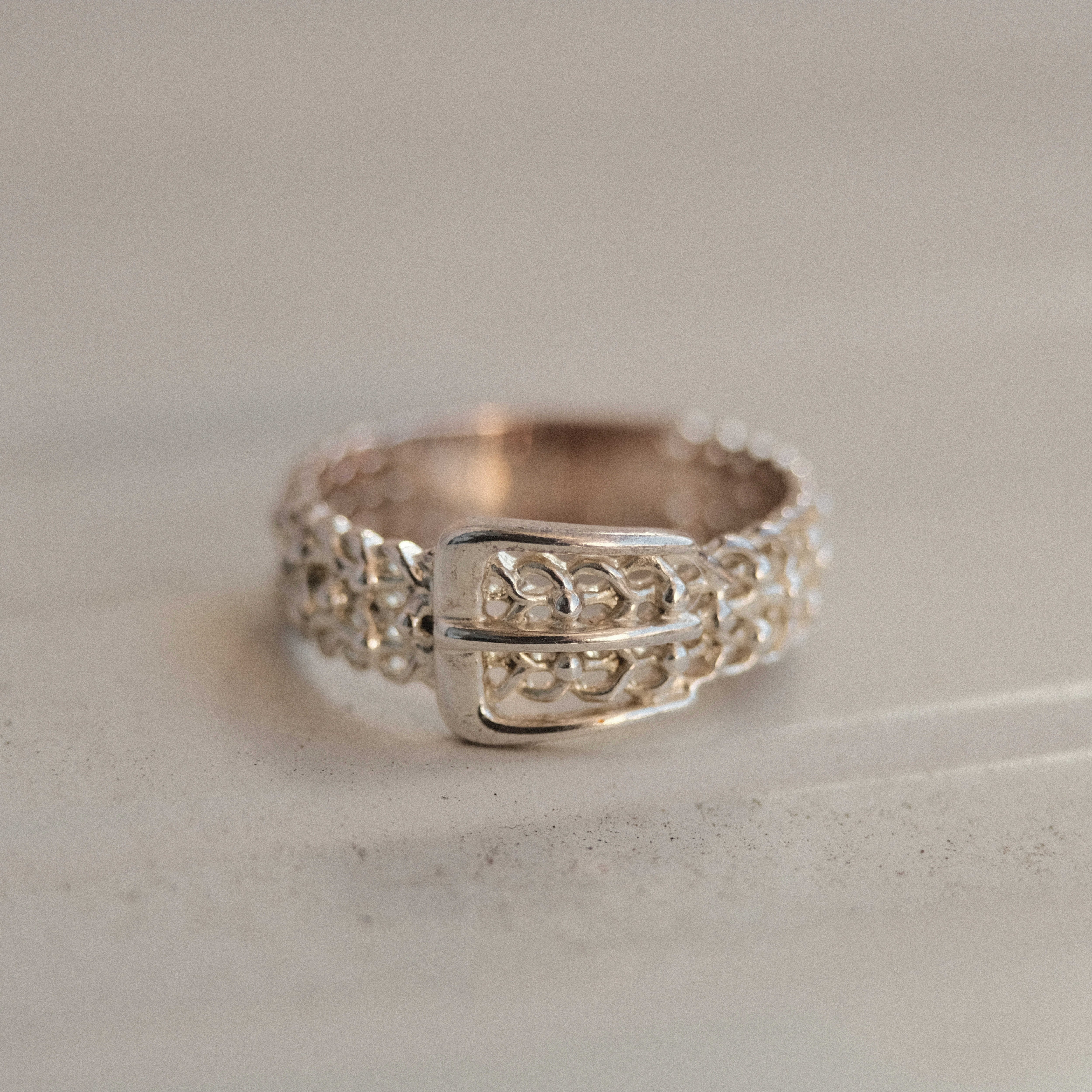 同モチーフのリングと聞くとエルメスのブックルセリエをイメージする方が多いかもしれませんが、実はブリティッシュヴィンテージやアノニマスブランドにおいて見られるものでもあります。この個体はその中でも有名ブランドに制作されたものではなく、ユニークな解釈をもとにデザインされたベルトモチーフが一際個性的な雰囲気を放つ魅力的なものです。
