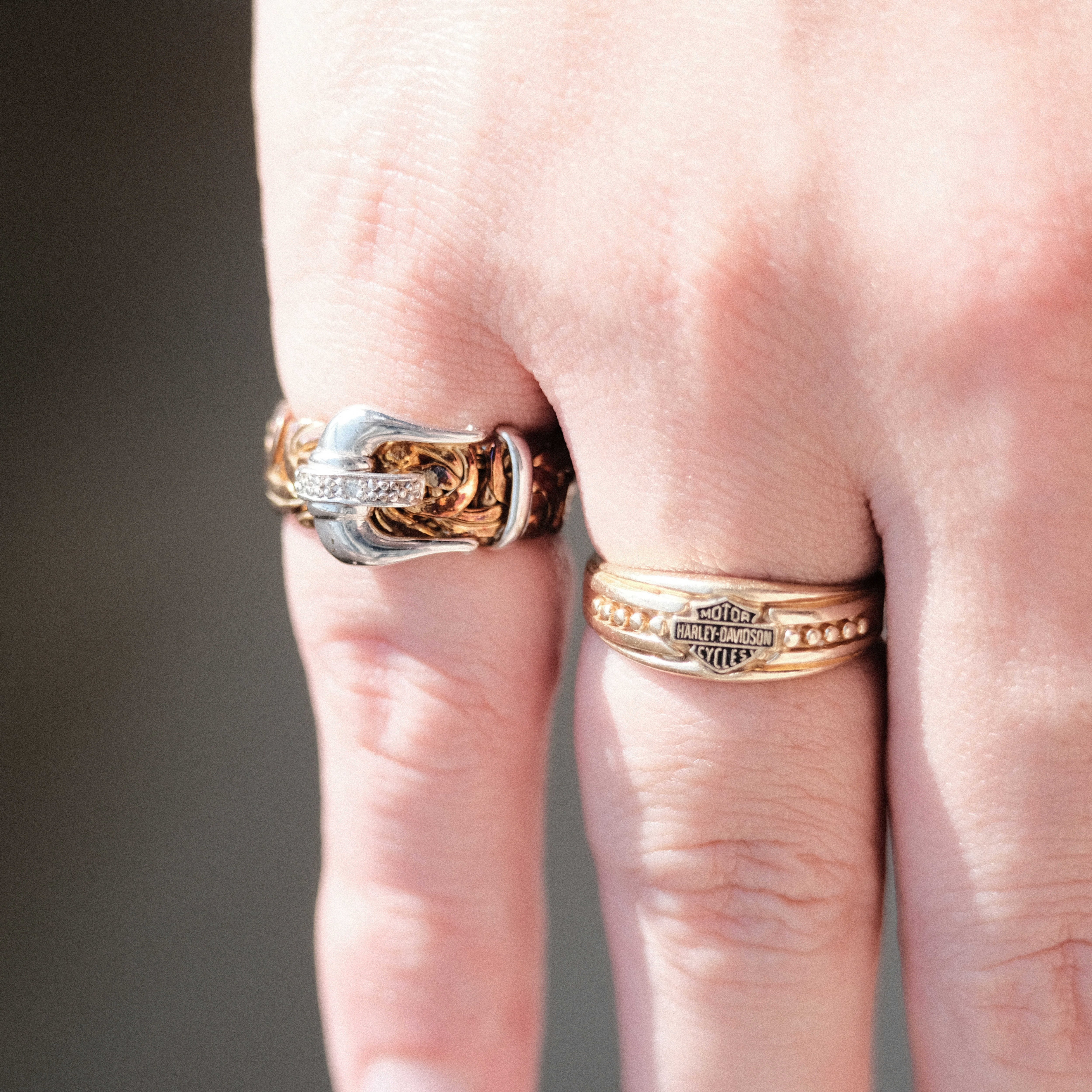 ゴールドカラーが焼けブロンズライクでオレンジにも見えるトーンがどこかインダストリアルでテンダーロインなどのアメカジジュエリーチックなラフさを放っており、それに対し心地よいコントラストを放つシルバーカラーとダイヤモンドがバランス良く上品さを加えており、カジュアルでもエレガントでもある奥行きのある魅力を放つジュエリーに昇華されています。