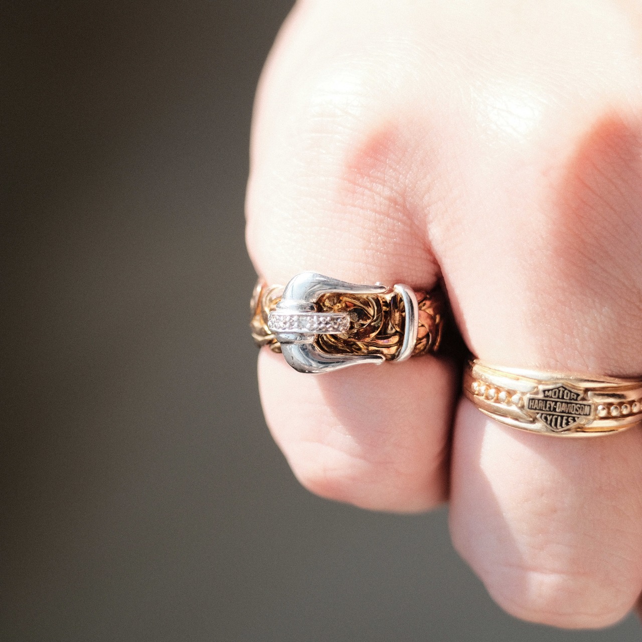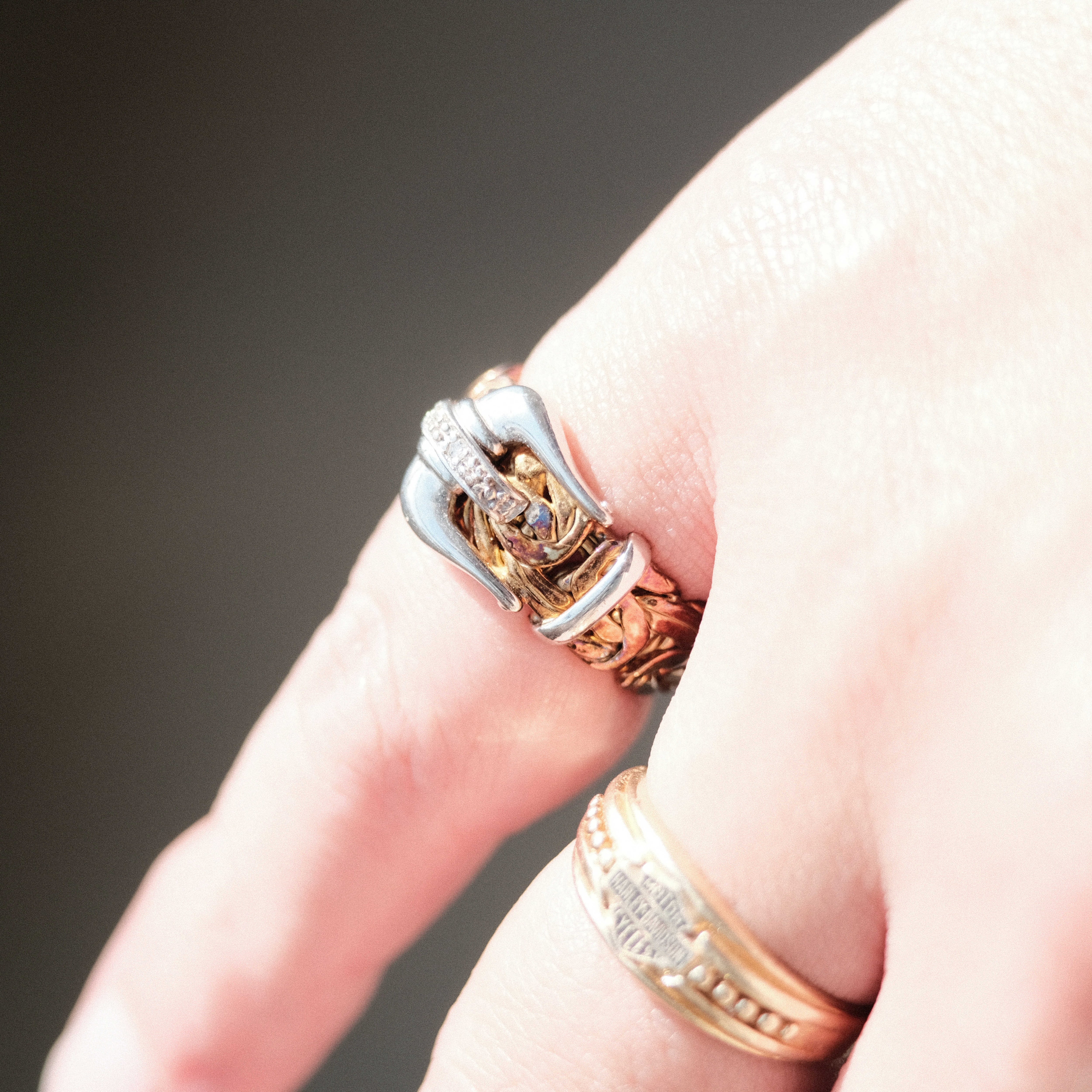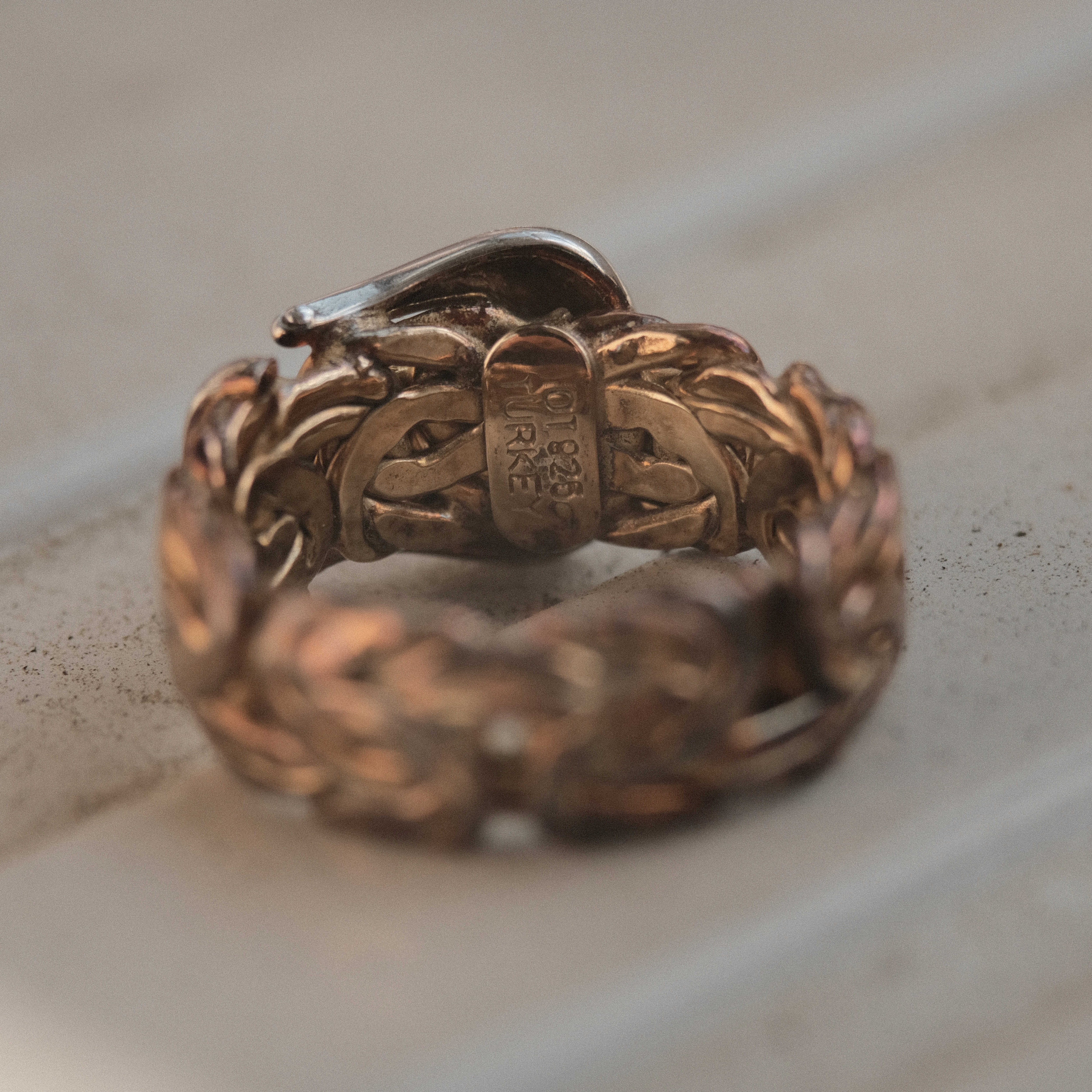 トルコらしいアラベスク模様のようなバンドにベルトバックルを加えたデザインがシルバーで表現されており、そこにエイジングとダイヤモンドセッティングのアクセントが加えられ、アラビアンな上品さにアメリカ臭さを感じるラフさの合わさった個性的な個体です。