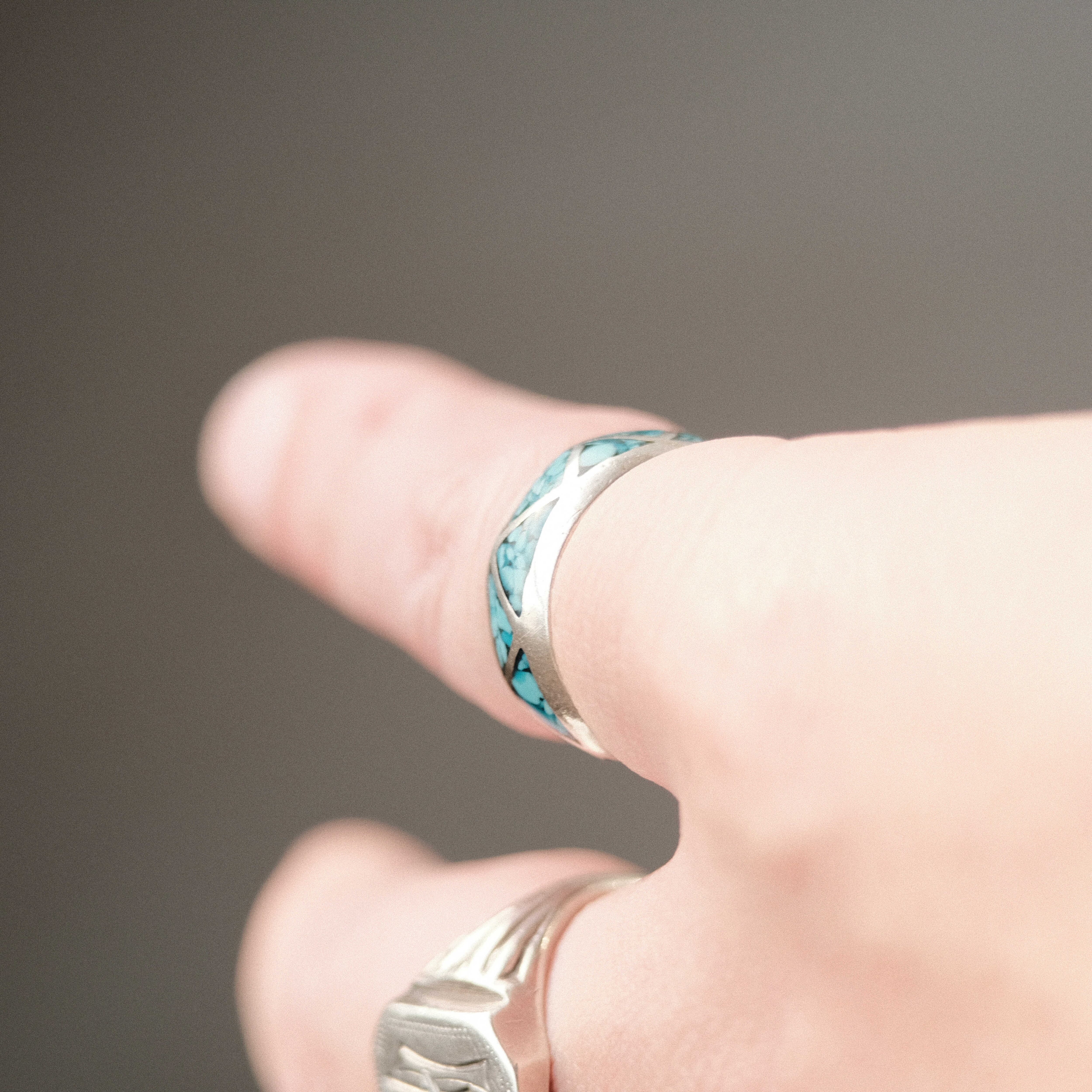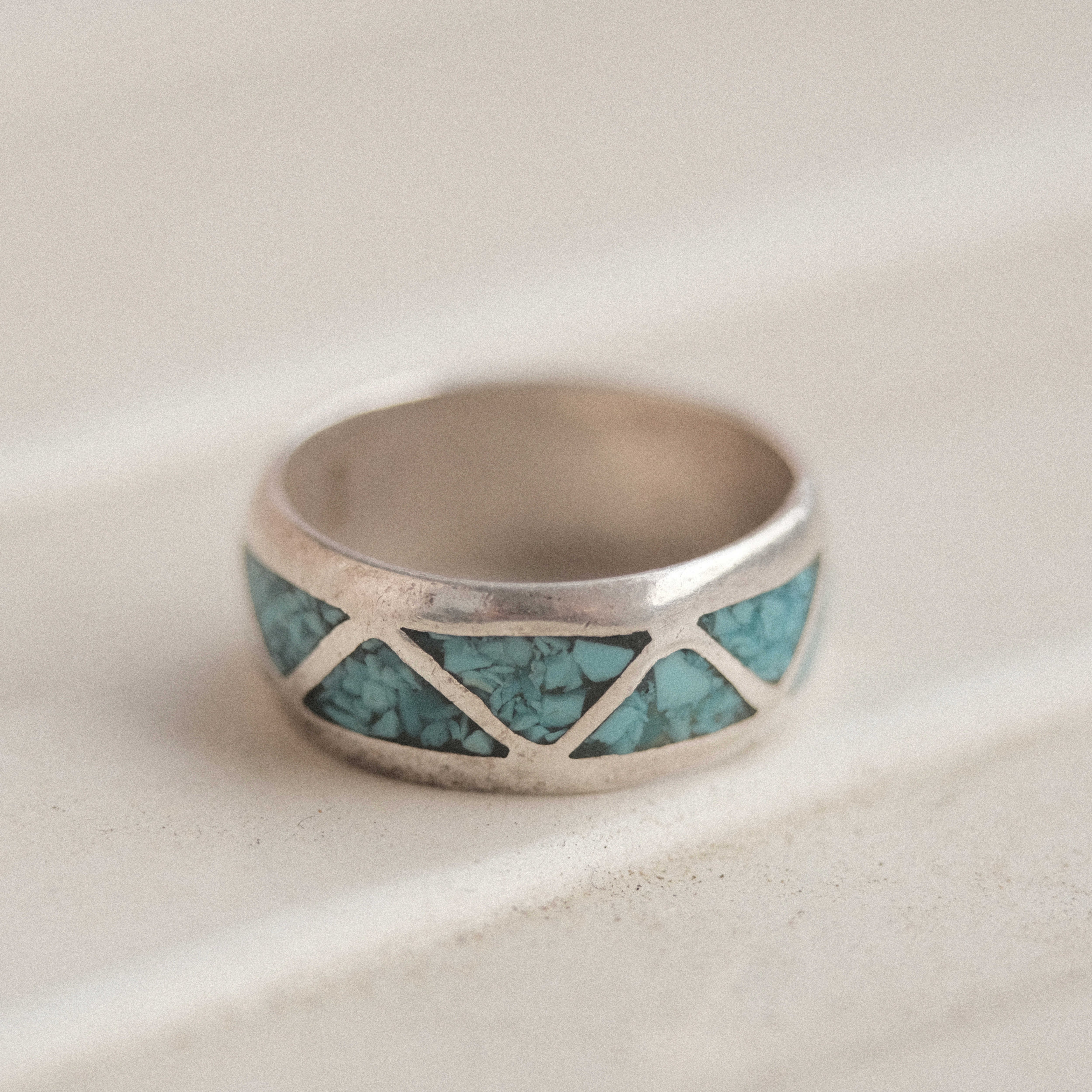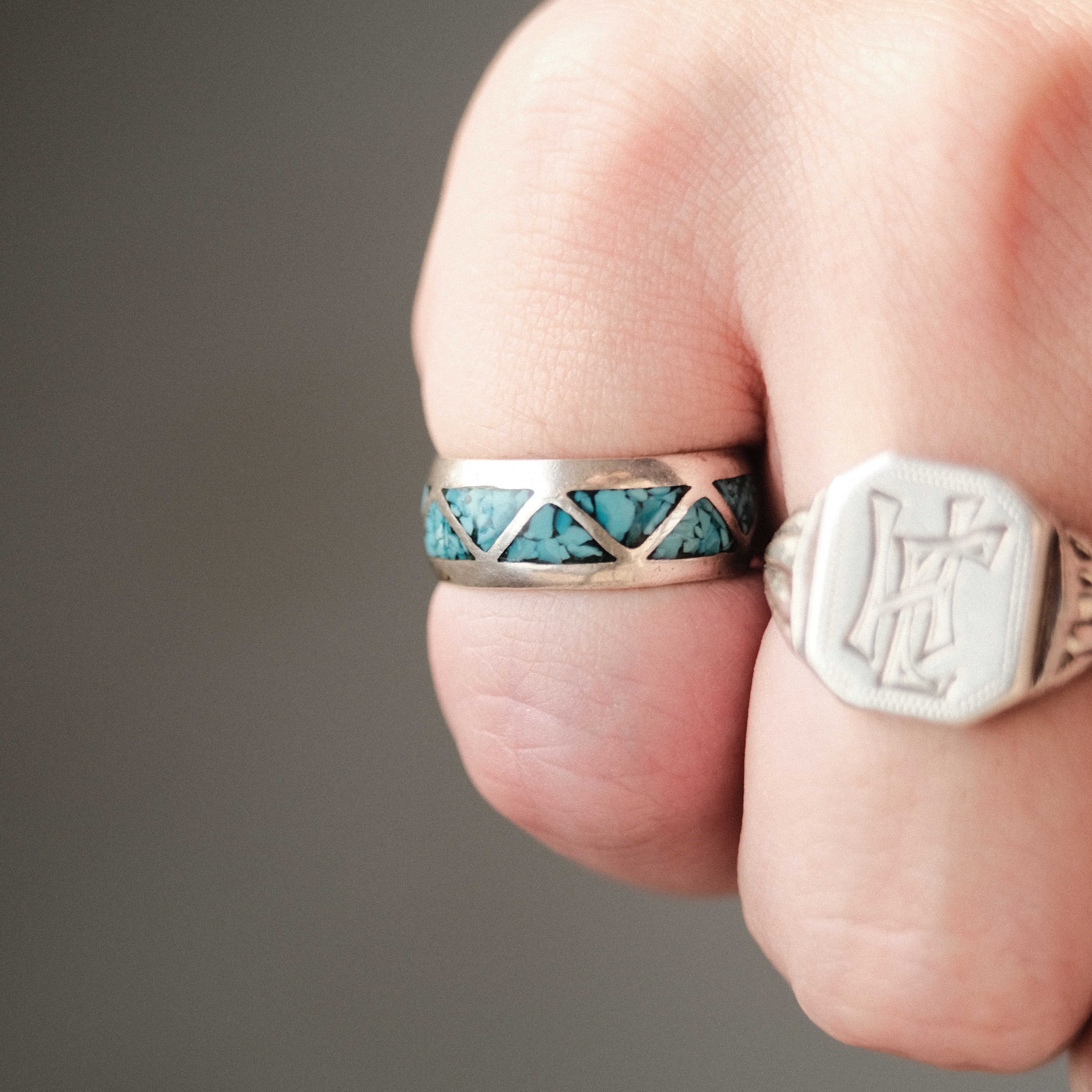 交互に配置されたトライアングルシェイプ中にターコイズがセッティングされており、王道のヴィンテージアメリカンジュエリーの魅力を放ちます。