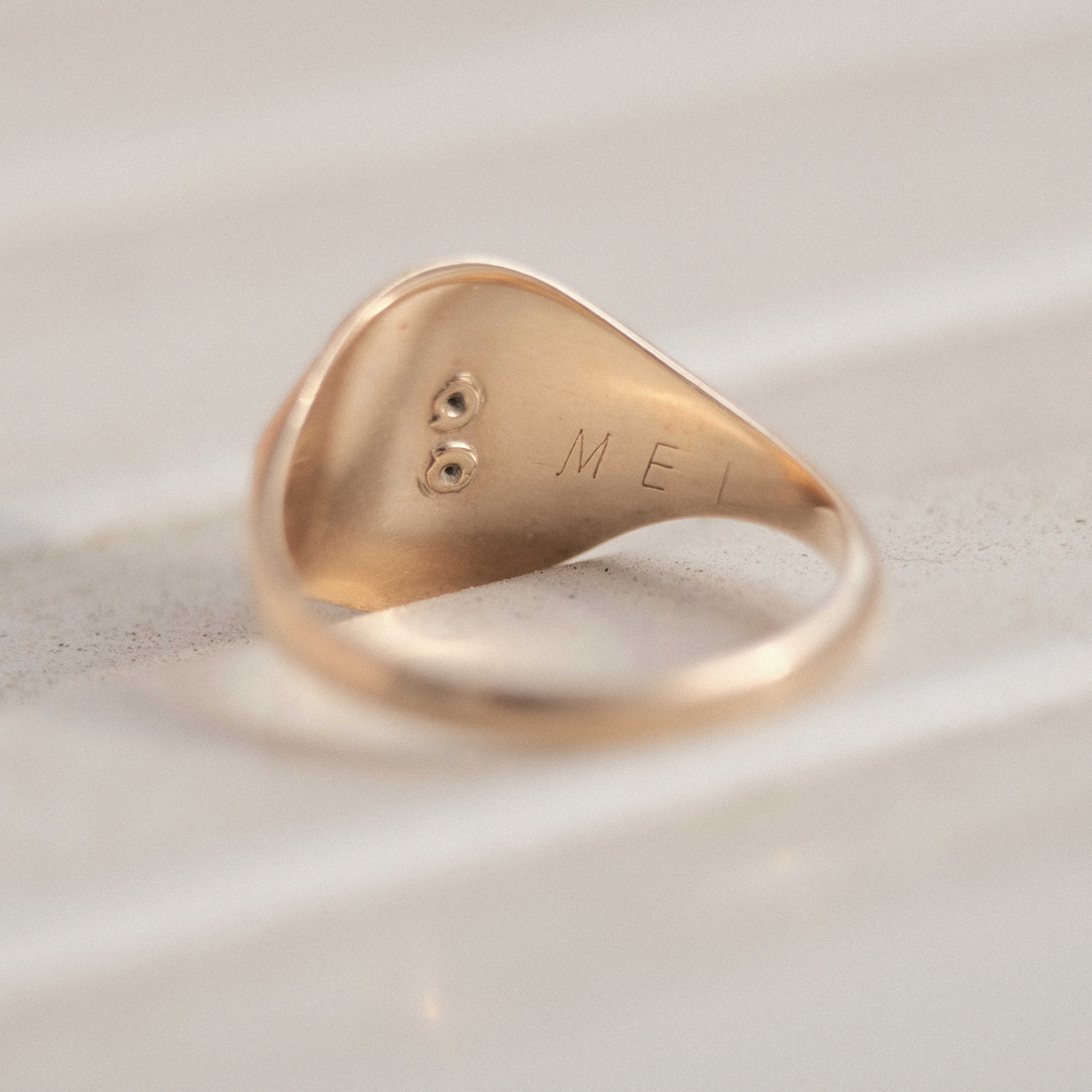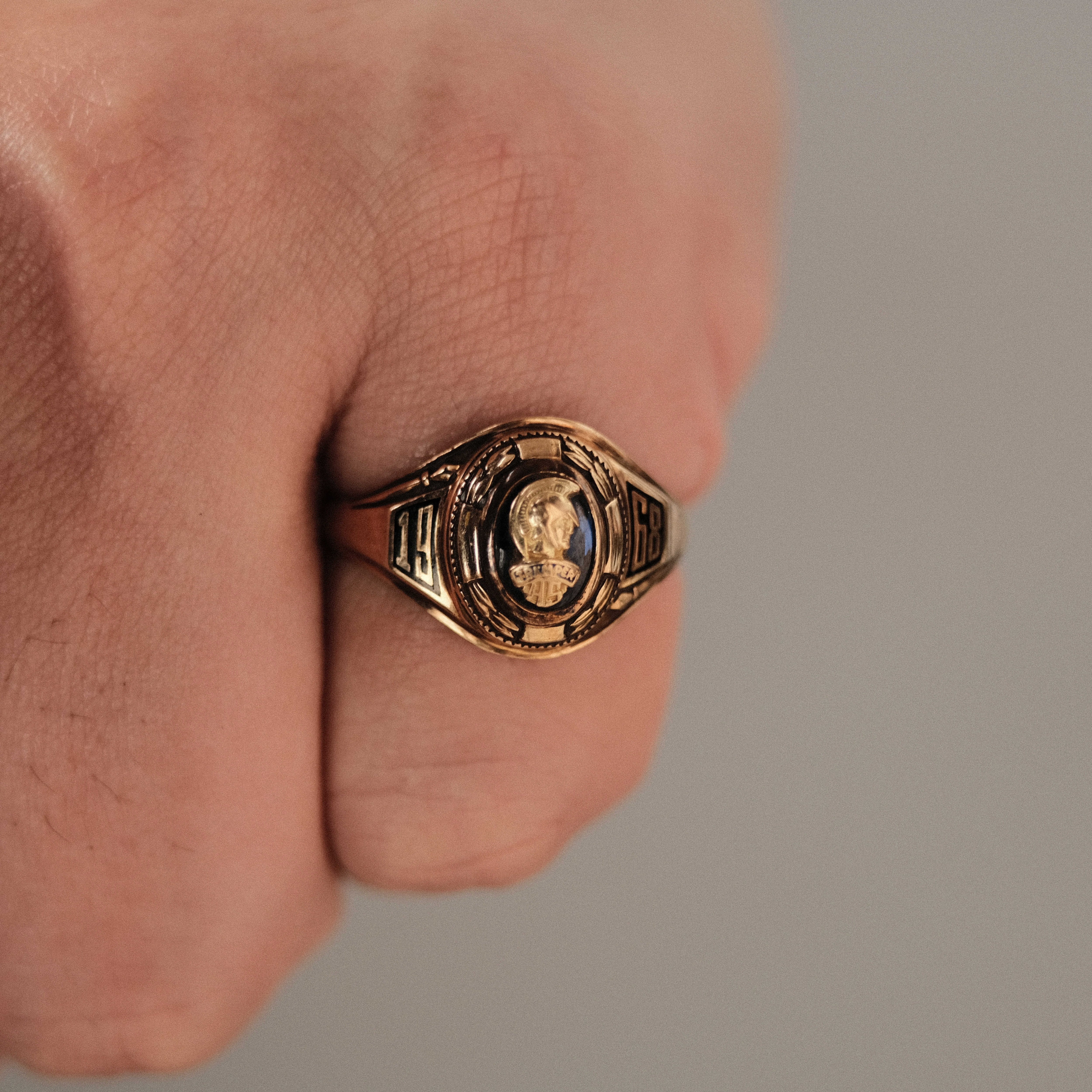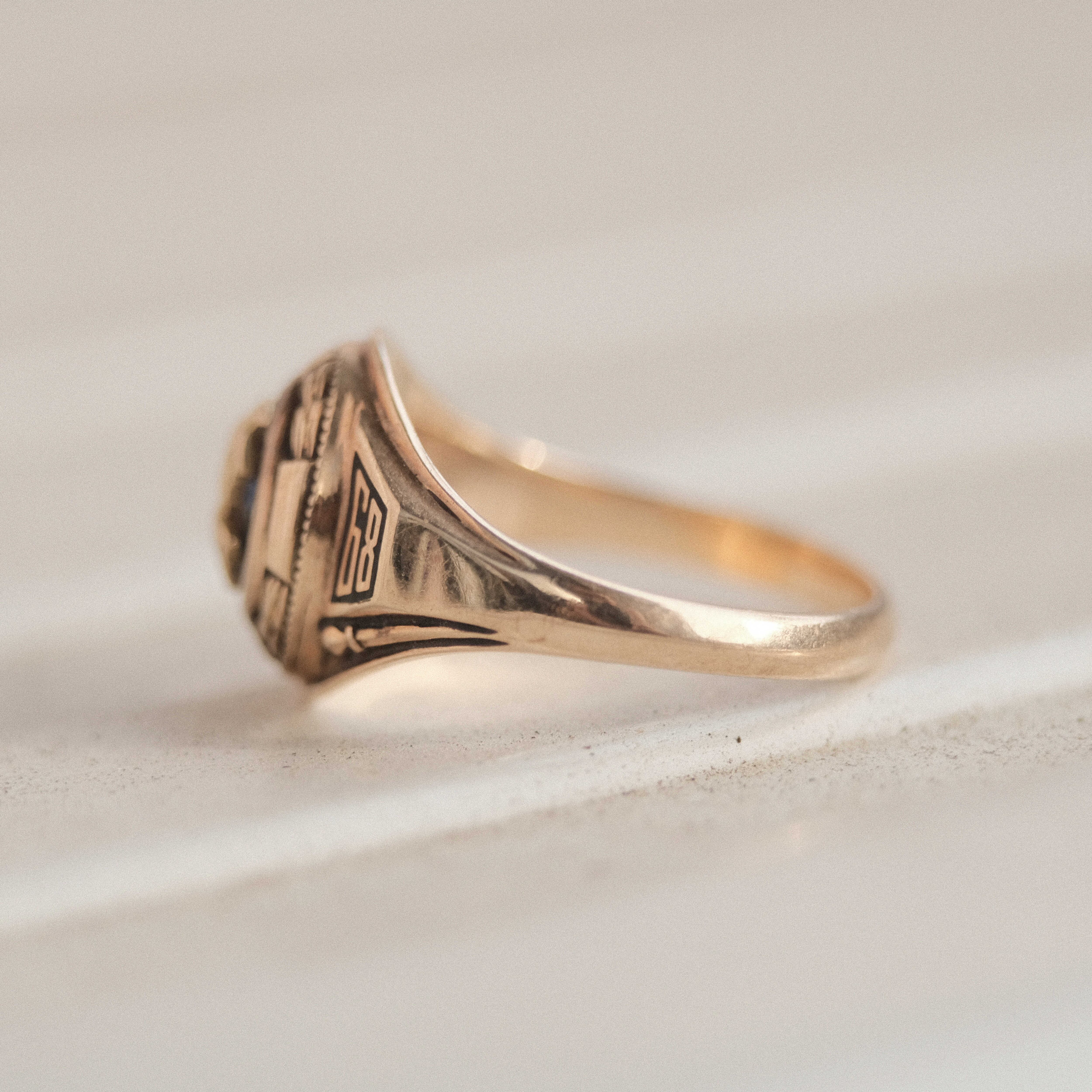 この個体には"TREMPER HS"の文字と"1968"の数字が見られ、1968年TREMPER高校卒業記念として制作されたものと考えられます。リングの内側には当時のオーナーのものと思われるイニシャルが刻印されており、その人のその後の人生や卒業当時の誇りに満ちた気持ちなどを想像すると、よりこのリングに人間的・感情的なつながりを感じたり、デザインだけではない高揚感が感じられるはずです。